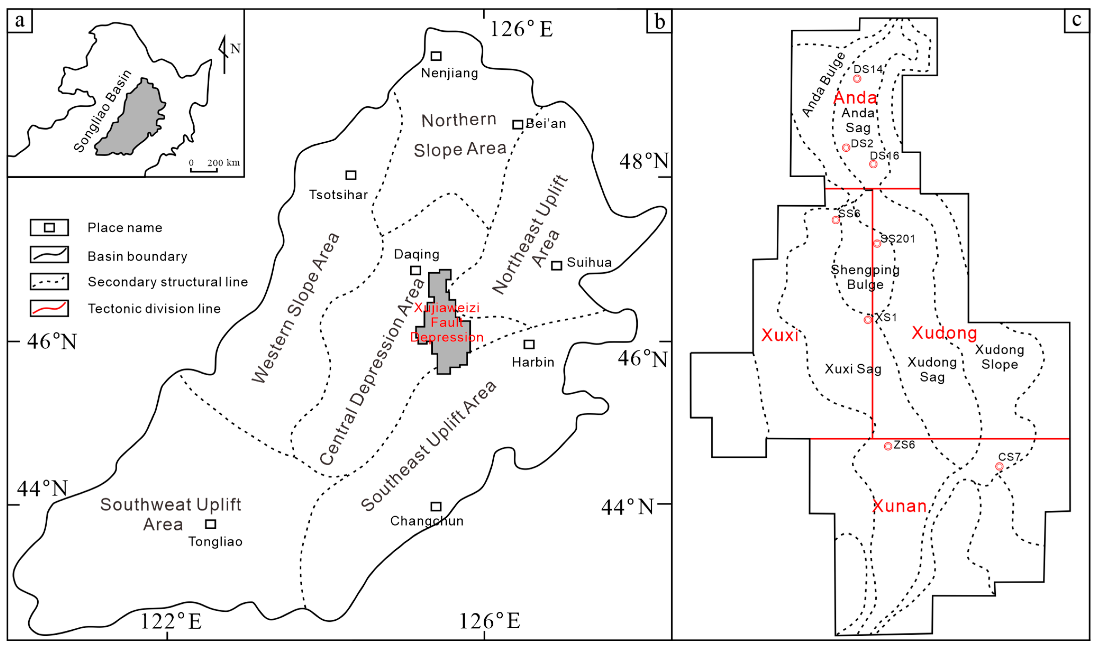 - Meng, Q.; Bai, X.; Zhang, W.; Fu, L.; Xue, T.; Bao, L. Accumulation and exploration of petroleum reservoirs in West slope of northern Songliao Basin, China. Pet. Explor. Dev. 2020, 47, 236–246. (In Chinese) [Google Scholar] [CrossRef]