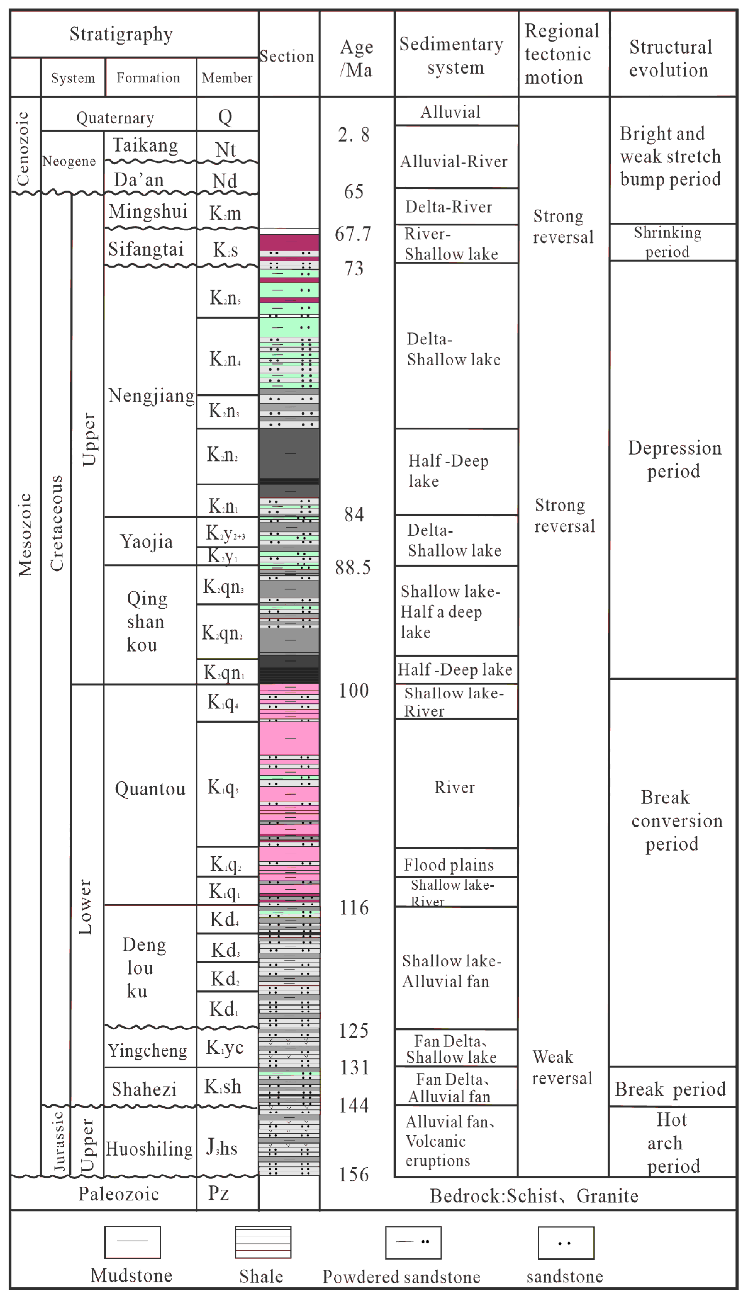 - Zhang, H.; Wang, X.; Jia, C.; Li, J.; Meng, Q.; Jiang, L.; Bai, Y.; Zheng, X. Whole petroleum system and hydrocarbon accumulation model in shallow and medium strata in northern Songliao Basin, NE China. Pet. Explor. Dev. 2023, 50, 784–797. (In Chinese) [Google Scholar] [CrossRef]