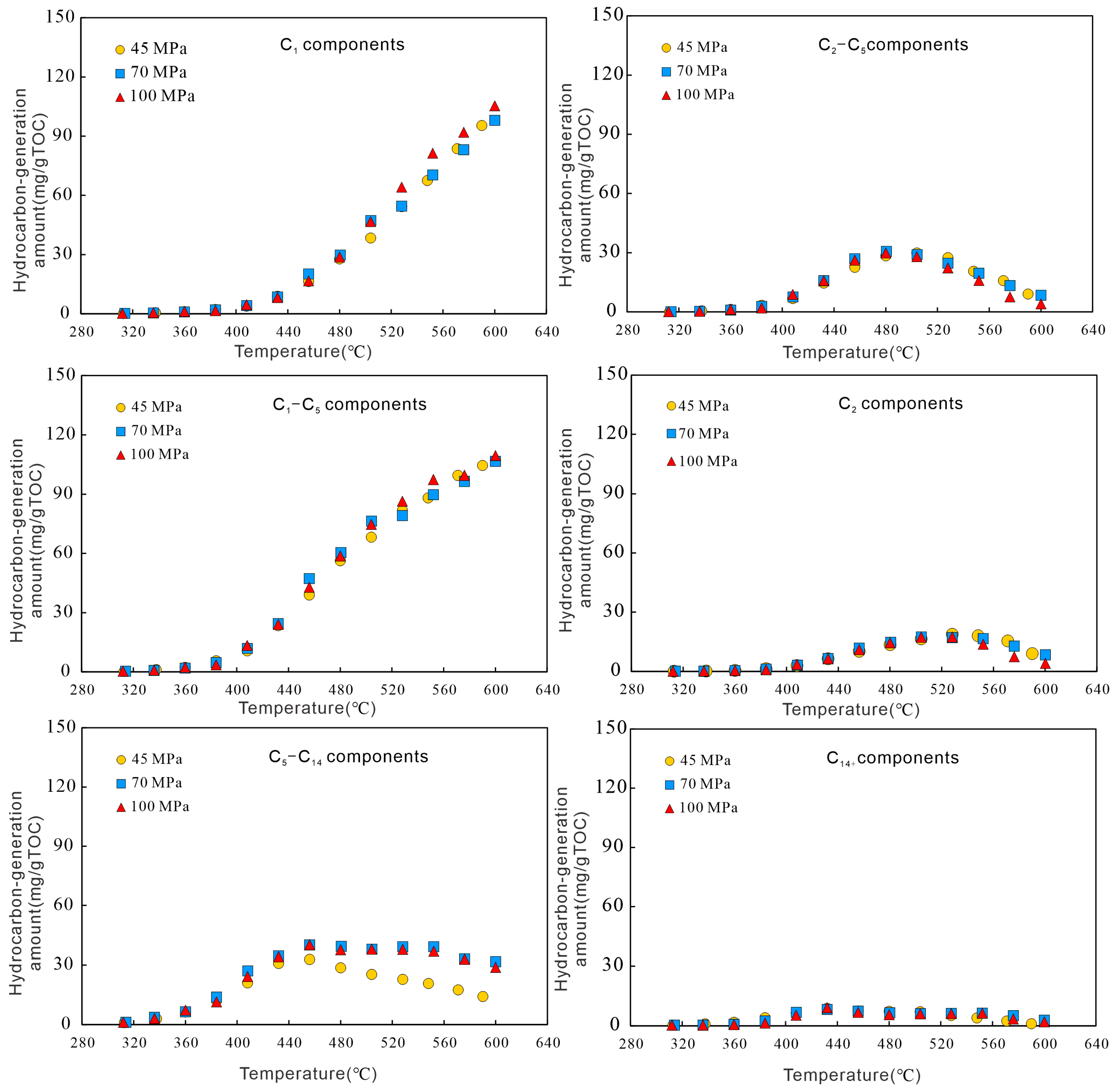 - High pressure can promote the transformation of heavy hydrocarbon gases in the C1–C5 components to methane, but the promoting effect is limited. In contrast, high pressure has a certain effect on the preservation of liquid hydrocarbon components, and this preservation effect may be caused by the transformation of unstable saturated hydrocarbons to aromatics.