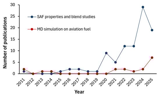 Publication trend on properties of SAF blends and MD simulations of aviation fuel properties (date of access: 28 October 2025).