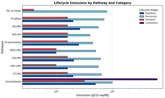The environmental impact of SAF production is assessed through lifecycle emissions, which include all stages from feedstock acquisition and processing to transportation and final combustion. Figure 4 provides an overview of predicted emissions in several SAF production techniques in Table 1 and conventional jet fuel. As can be seen in Figure 4, the conventional fuel exhibits the largest emission in g(CO2-eq)/MJ in every single phase of the production lifecycle, particularly from the combustion phase [35]. The most obvious phase of conventional jet fuel is combustion, which is over 10 times larger than other phases, such as feedstock acquisition, processing and transportation, although those phases of the lifecycle are significantly larger than the phases in SAF pathways. Note that the y-axis of Figure 4 is log-scaled, not linear.