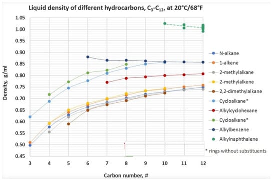 Fuel density affects the loaded fuel weight and operational range of aircraft, which are significant for the capacity of aircraft, particularly for limited fuel volume capacity [43]. It also affects the calculations of flow rate and the design of the fuel metering system and fuel storage tank [44]. According to ASTM D7566-18 [45] and D1655-18 [46], density of aviation turbine fuels such as Jet A and Jet A-1 must be 0.775–0.840 g/cm3 (0.775–0.800 g/cm3) at 15 °C. It is influenced by the chemical composition of hydrocarbon fuel. The hydrocarbon fuels’ density reduces in the following order: aromatics > cyclo-paraffins > paraffins when comparing with the same amount of carbon atoms; that means fuels with a lower hydrogen-to-carbon molar ratio exhibit higher density [43]. A correlation exists between density and carbon number for alkanes, cyclo-alkanes and aromatics, as illustrated in Figure 5 [47]. N-alkanes and iso-alkanes exhibit the lowest density, which rises by adding ring structures such as mono-, di-, and tri-cyclo-alkanes, as well as aromatics. The lower density of alkanes and the greater density of aromatics usually balance each other; however, many hydrocarbons within the jet fuel carbon range still fall outside the ASTM-specified density limits. Synthetic fuels with a greater percentage of n- and iso-alkanes, such as FT-SPK and HEFA, need to be blended with higher-density fuels with aromatics like Jet-A to meet specifications [48,49].