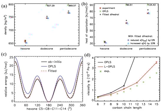 - Ghahremanpour, M.M.; Tirado-Rives, J.; Jorgensen, W.L. Refinement of the Optimized Potentials for Liquid Simulations Force Field for Thermodynamics and Dynamics of Liquid Alkanes. J. Phys. Chem. B 2022, 126, 5896–5907. [Google Scholar] [CrossRef]