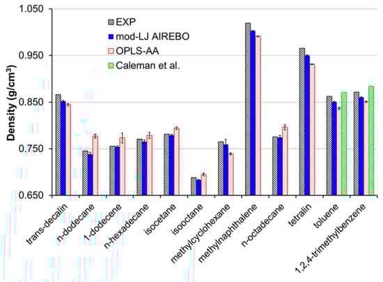 - Morrow, B.H.; Harrison, J.A. Evaluating the ability of selected force fields to simulate hydrocarbons as a function of temperature and pressure using molecular dynamics. Energy Fuels 2021, 35, 3742–3752. [Google Scholar] [CrossRef]