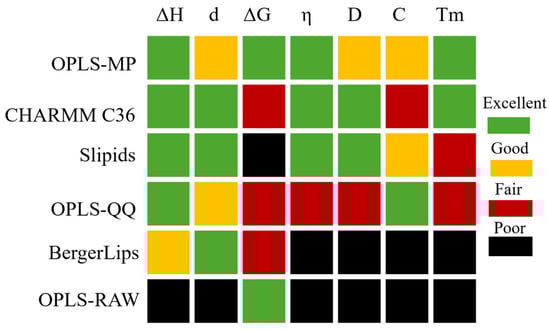 - Maciejewski, A.; Pasenkiewicz-Gierula, M.; Cramariuc, O.; Vattulainen, I.; Rog, T. Refined OPLS all-atom force field for saturated phosphatidylcholine bilayers at full hydration. J. Phys. Chem. B 2014, 118, 4571–4581. [Google Scholar] [CrossRef] [PubMed]