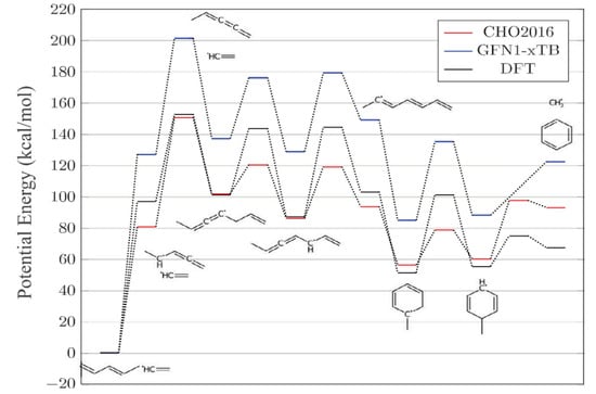 - Schmalz, F.; Kopp, W.A.; Goudeli, E.; Leonhard, K. Reaction path identification and validation from molecular dynamics simulations of hydrocarbon pyrolysis. Int. J. Chem. Kinet. 2024, 56, 501–512. [Google Scholar] [CrossRef]