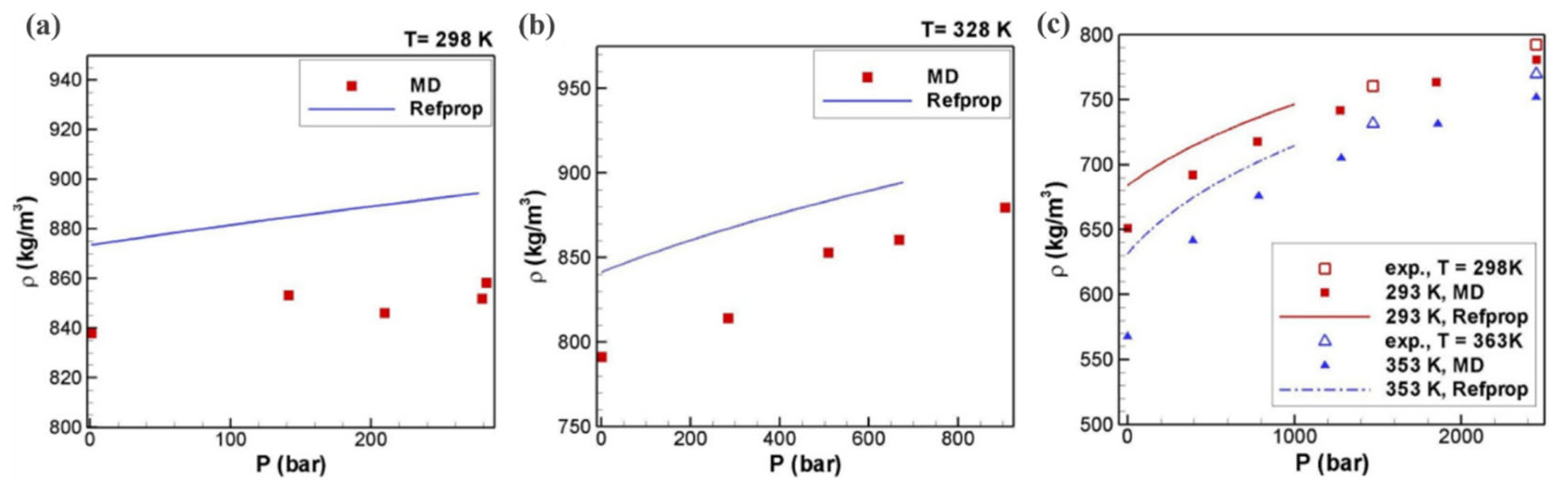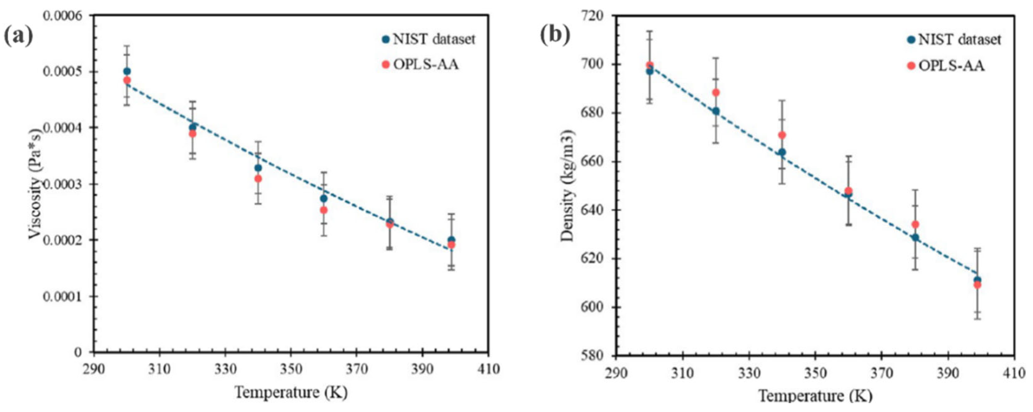 | Temperature (K) | OPLS-AA Density (g cm−3) | TraPPE-UA Density (g cm−3) | Δρ (g cm−3) |