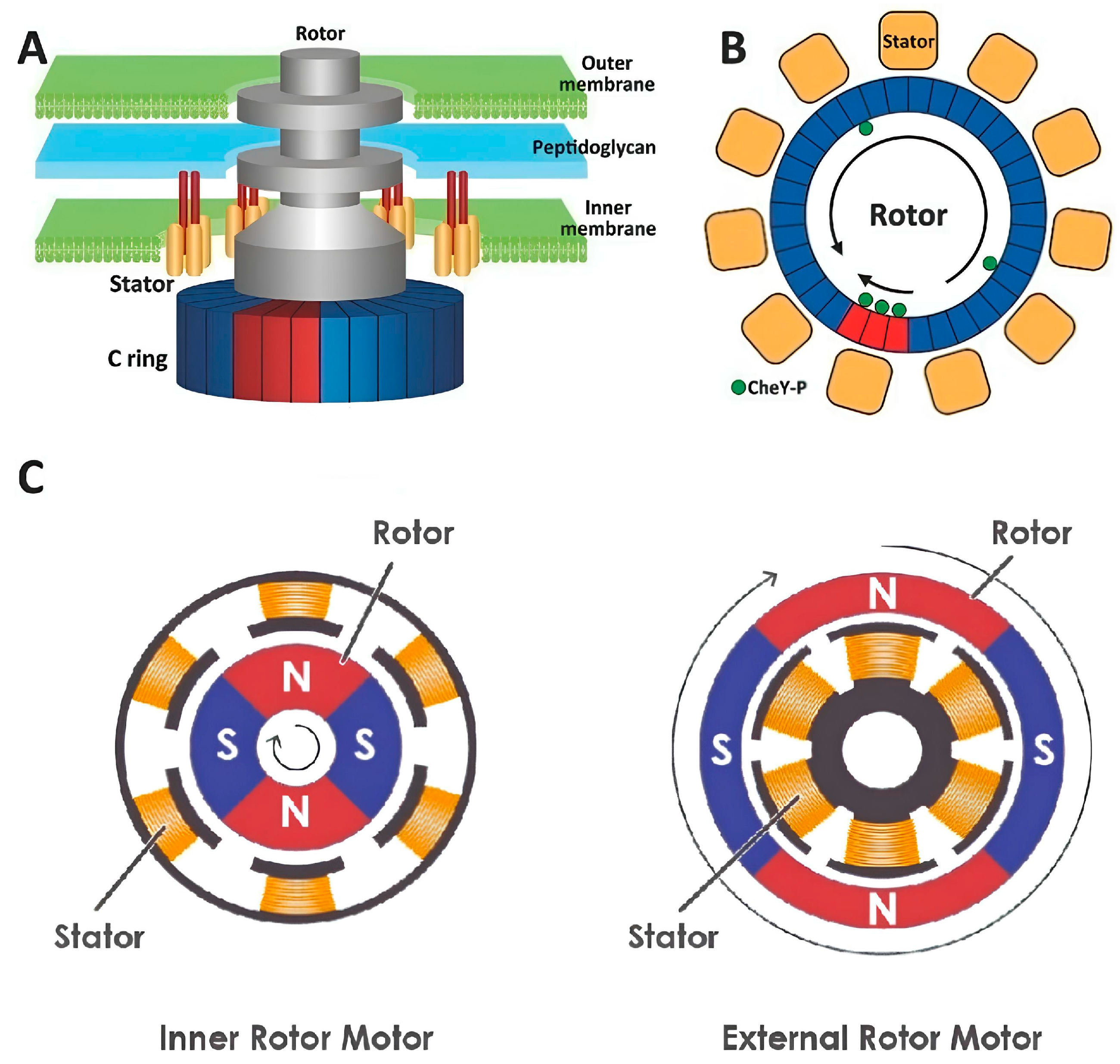 4]. These similarities demonstrate that movement systems in nature can serve as a source of inspiration for innovative motor designs in engineering. The bacterial flagellum is the best-known example of this structure, as it is a biological nanomotor driven by a proton gradient at the cellular level; however, it is not the only example [