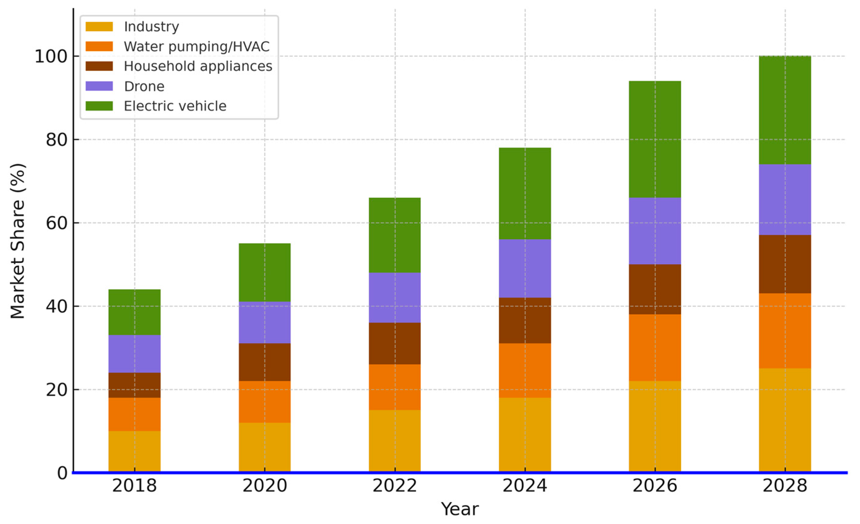 149]. While this market currently has very high growth potential, the sustainability of this growth depends on overcoming the technical and economic obstacles facing the technology. The increasing demand for BLDC motors in sectors such as automotive, consumer electronics, drones, and automation is putting pressure on manufacturers to deliver innovative solutions while controlling costs.