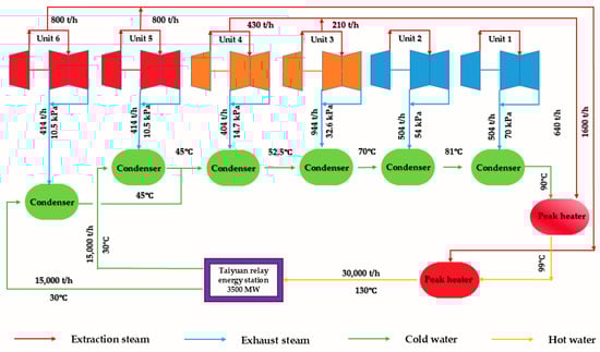 Low-temperature return water cogeneration systems, characterized by their large scale and complex configurations, typically employ multi-stage high back-pressure heating [1,2]. For instance, the Gujiao Power Plant [3] utilizes five-stage high back-pressure heating, Tuoketuo Power Plant [4] implements four-stage high back-pressure heating, and Lingwu Power Plant [5] adopts two-stage high back-pressure heating. These low-temperature return water cogeneration units demonstrate an approximately 40% higher heating capacity than conventional extraction steam heating systems [6], featuring enhanced thermo-electric coupling efficiency but limited potential for improvements in operational flexibility. Notably, such units typically handle substantial thermal loads for surrounding urban areas. For example, the Gujiao Power Plant, with a rated power output of 3120 MW, supplies 3500 MW of heat to Taiyuan City, making it the largest power and heat source in the region. The operational flexibility of these units significantly impacts regional power grid peak shaving, heating supply reliability, and the plant’s economic benefits.