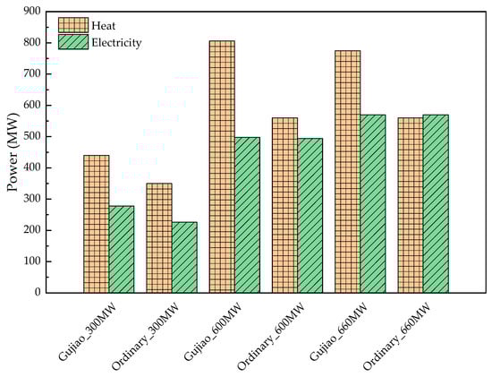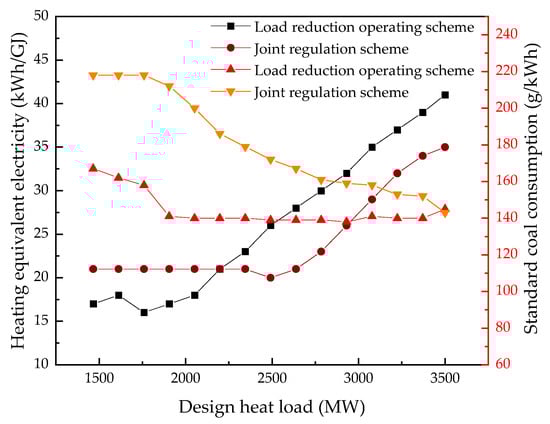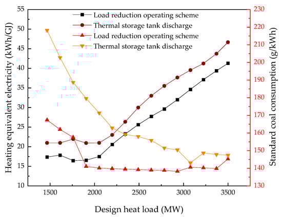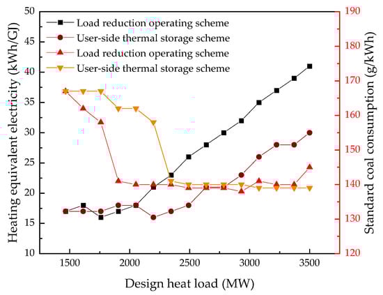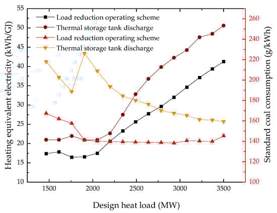 Table 3 summarizes the energy efficiency and profit of the Gujiao Power Plant when using the 20% user-side thermal storage scheme. During the heating season, compared with the load reduction operating scheme in Section 2.2.3, the unit heating load can be further reduced by 0~700 MW; the minimum power generation load rate can be reduced from 44~85% to 44~72%, with an approximately 10% reduction, but it still cannot independently meet the power plant’s flexibility enhancement needs. As shown in Figure 4, for the user-side thermal storage scheme, the heating equivalent electricity decreases by an average of about 5.6 kWh/GJ, while the standard coal consumption for power generation increases by an average of about 4.7 g/kWh; this is due to the decrease in the unit heating load and the increase in the proportion of exhaust steam for heating.