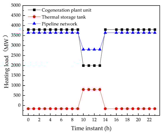 From 10:00 to 14:00, the unit heating load is proactively reduced by approximately 20%; from 14:00 to 10:00, the heating load is increased to ensure users’ daily heat supply. When the design heat load of the power plant is 1795 MW or lower, reducing the heating load has little impact on the minimum power generation of the unit. In such cases, the unit heating load for the user-side thermal storage scheme can be set to 1466 MW.