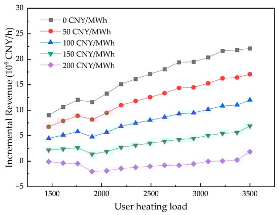 Comprehensively considering the changes in the heating and power generation revenue and coal-fired costs [17], the total revenue increases by approximately 43,000 CNY/a. When the unit heating load is lower than 2638 MW, the power generation load rate is below 60%, and the plant can obtain an average peak shaving revenue of about 97,000 CNY/h.