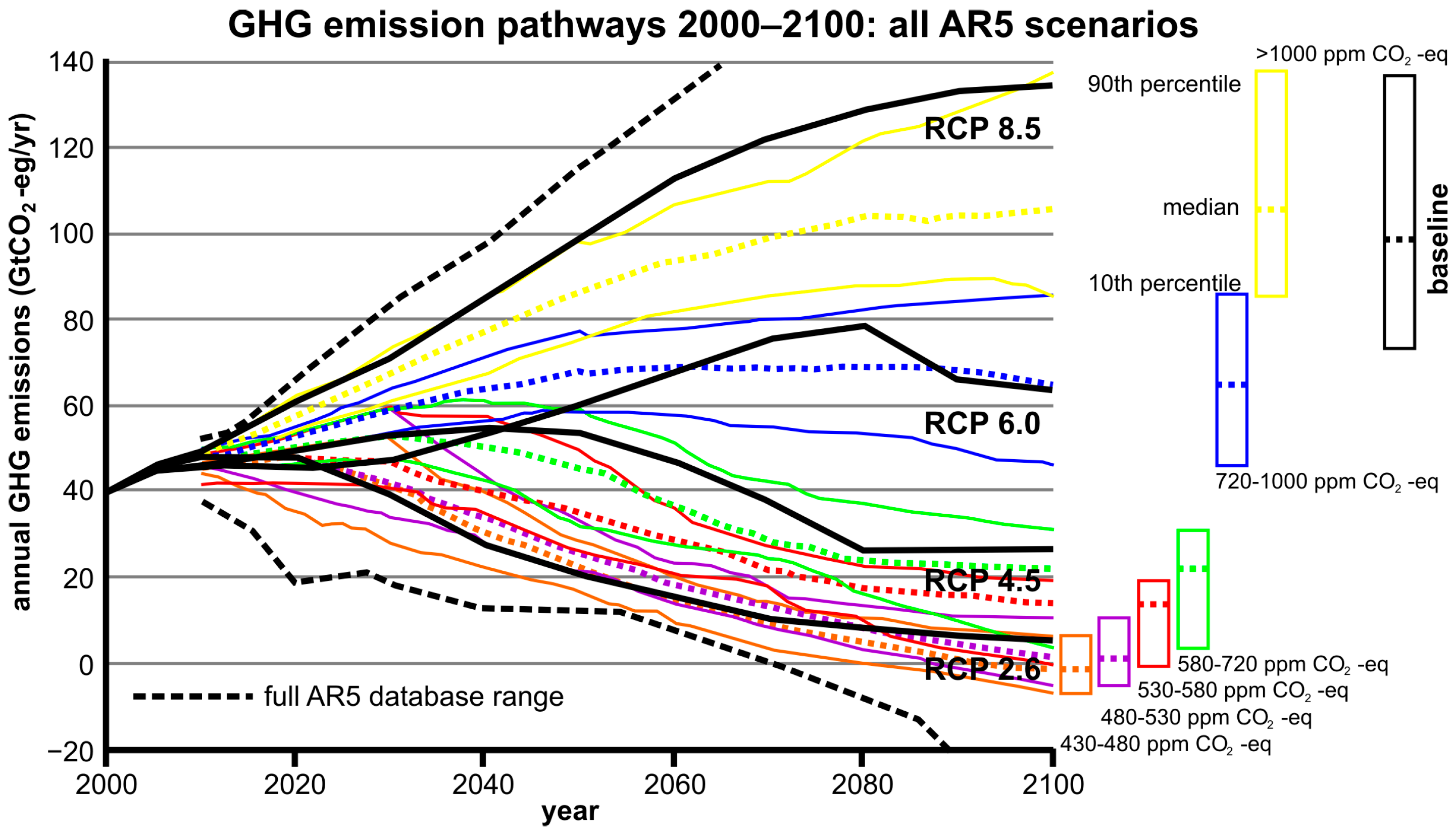 Figure 1—which are used, among other purposes, to estimate the average increase in the planet’s temperature. These scenarios correspond to the estimated levels of global radiative forcing in the upper layers of the atmosphere caused by greenhouse gases in the year 2100, amounting, respectively, to 2.6, 4.5, 6.0 and 8.5 W/m