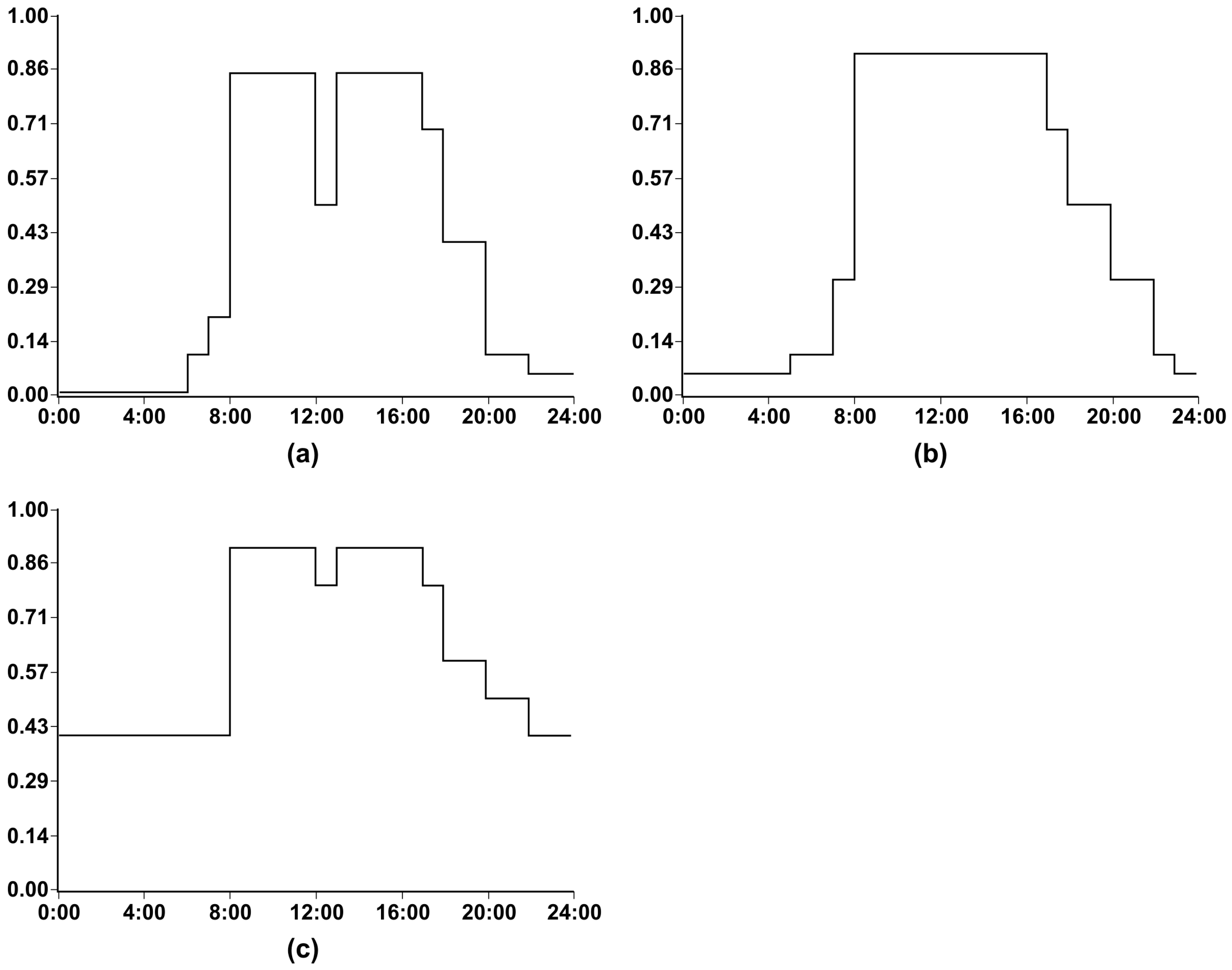 38] for a specific human physical activity: at a low metabolic rate (e.g., sewing, accounting or typing) the air temperature in rooms (in winter) is 20 ÷ 22 °C, and in summer: 23 ÷ 26 °C. During cooling periods, 24 °C was assumed during working hours and 27 °C for the remainder of the day. For heating, the corresponding values were 21 °C during working hours and 16 °C outside these hours.