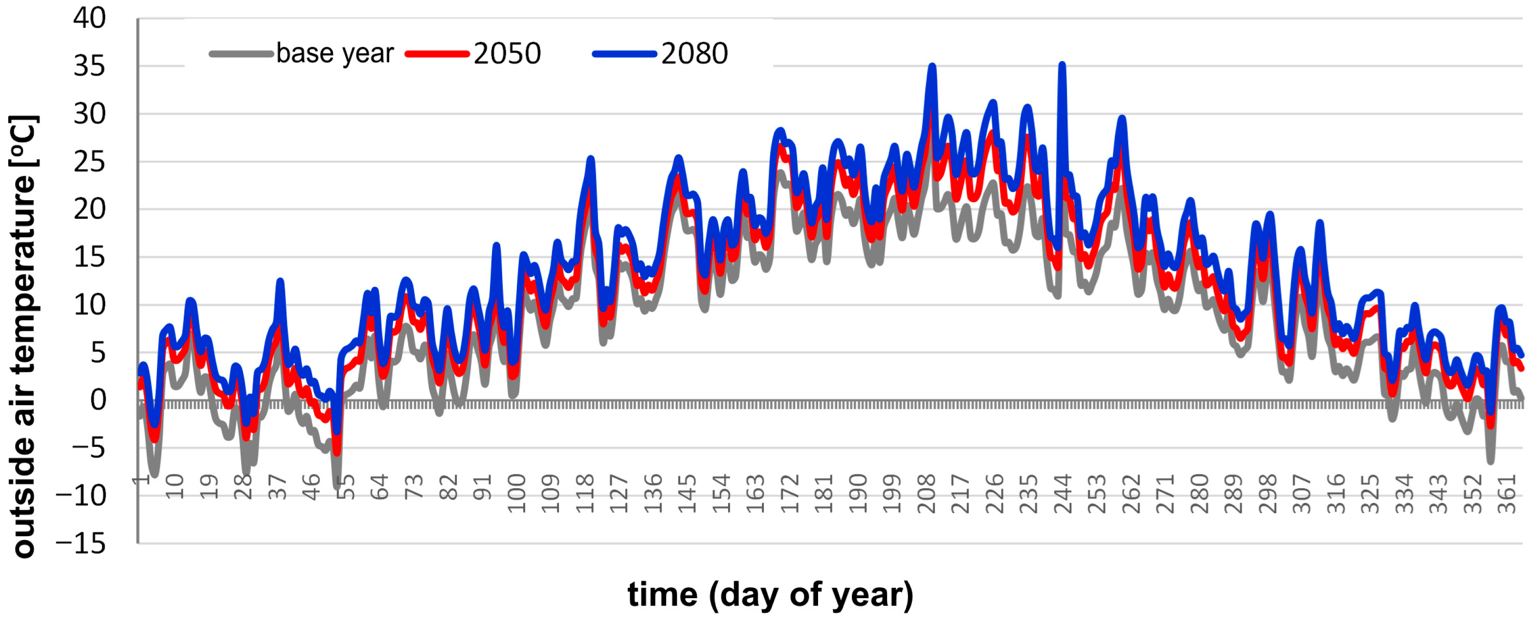 Figure 6). The minimum value of the average daily outside air temperature is −8.9 °C, −5.4 °C and −3.2 °C for TMY, 2050 and 2080, respectively, so it increases by 2.5 °C in 2050 and by 5.7 °C in 2080 compared to the base year. The maximum value of the average daily outside air temperature is 28.3 °C, 32.3 °C and 35.1 °C for TMY, 2050 and 2080, respectively, so we observe an increase of 4 °C in 2050 and 6.8 °C in 2080 compared to the base year.