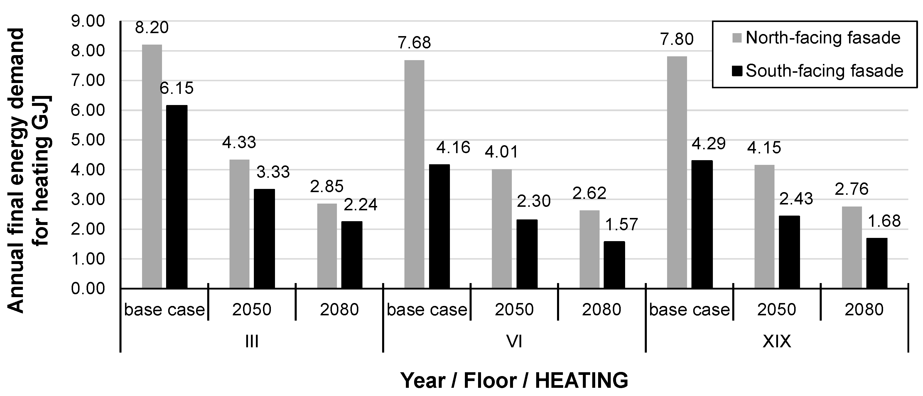 Considering the results for heating, it can be concluded that for the south-facing façade, the difference in final energy demand between individual floors is Δ = −0.54 ÷ 1.09 GJ in 2050 and Δ = −0.80 ÷ 1.23 GJ in 2080. The smallest difference occurs on the 19th floor, which can be attributed to the absence of shading from neighbouring buildings. For the north-facing façade, the difference between individual floors is Δ = −1.08 ÷ 1.09 GJ in 2050 and Δ = −1.47 ÷ 1.50 GJ in 2080.