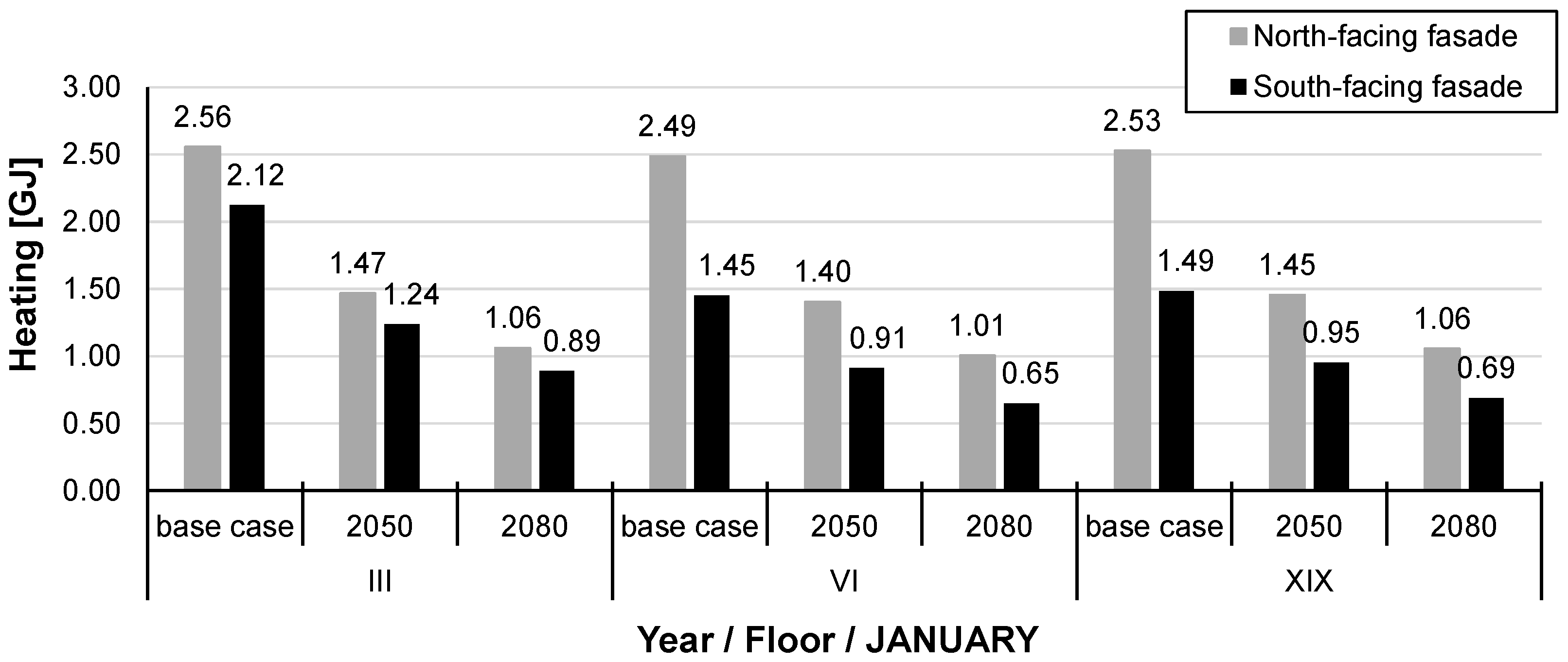 Analysing the final energy demand for heating in January reveals that the south-facing floors exhibit lower values than the north-facing floors (