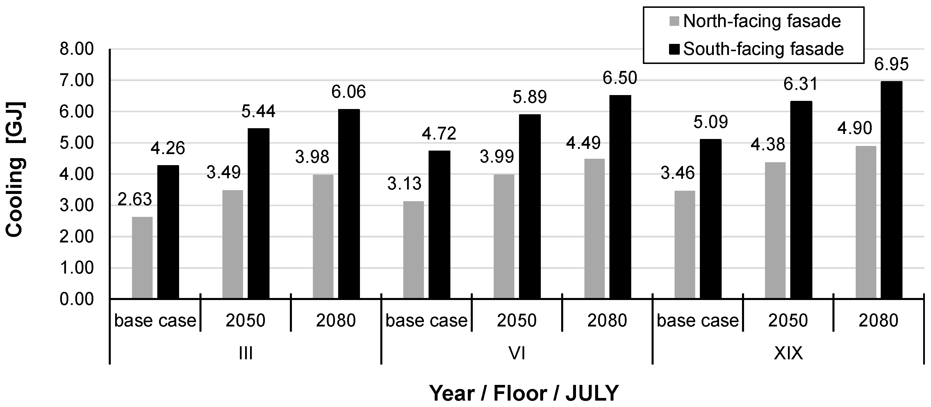 The results indicate that, for the south-facing façade, the difference in final energy demand for cooling is Δ = +1.17 ÷ 1.22 GJ in 2050 and Δ = +1.78 ÷ 1.86 GJ in 2080. The greatest increase occurs on the 19th floor, which can be attributed to the absence of shading from adjacent buildings. For the north-facing façade, the difference is Δ = +0.86 ÷ 0.92 GJ in 2050 and Δ = +1.35 ÷ 1.44 GJ in 2080.