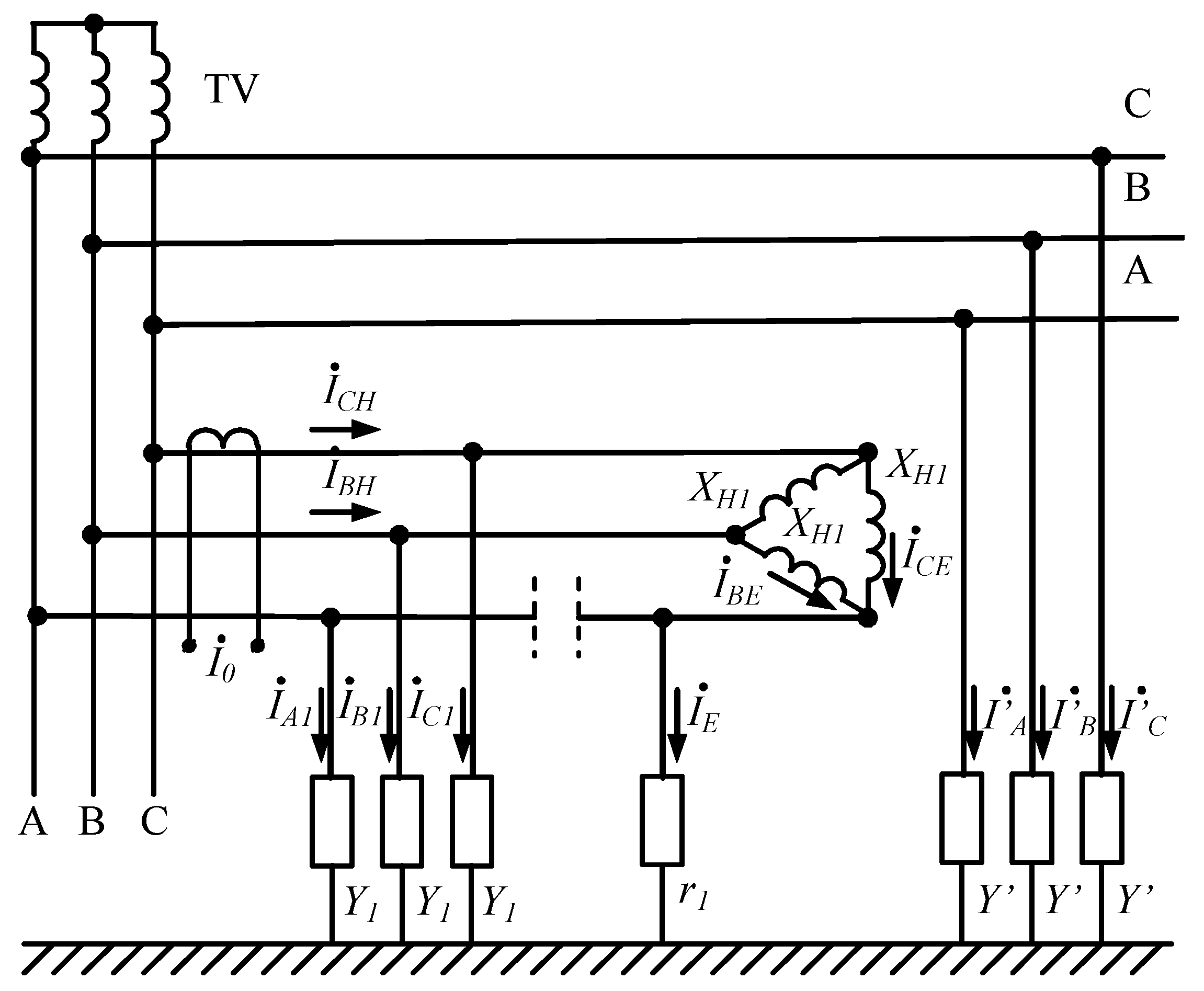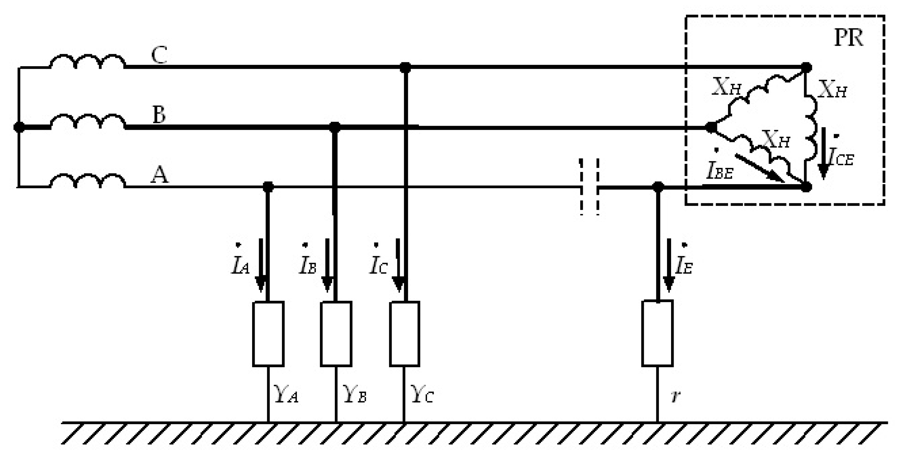 Distribution network replacement scheme for research zero-sequence voltages for earth faults on the side of the power receiver (PR): YA, YB, YC—conductivity of the insulation relative to the earth of the respective phases, r—transient resistance at the place of damage, XH = ωLH—inductive reactance of the phase-to-phase winding of the power receiver, IBE, ICE—ground-fault currents of phases B and C through load resistance and transient.