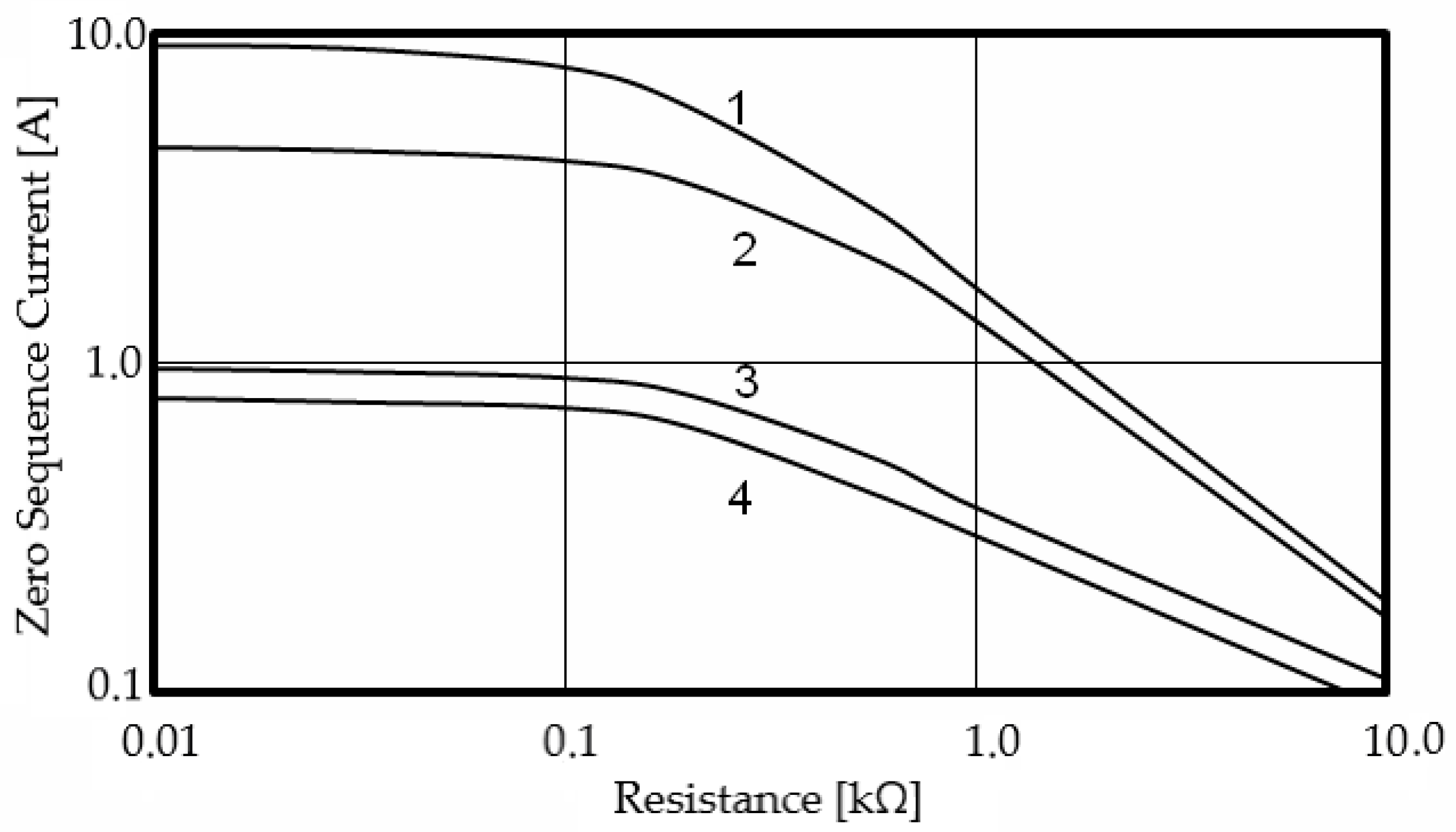 Figure 6 presents the variation in the zero-sequence current magnitude as a function of the transient resistance