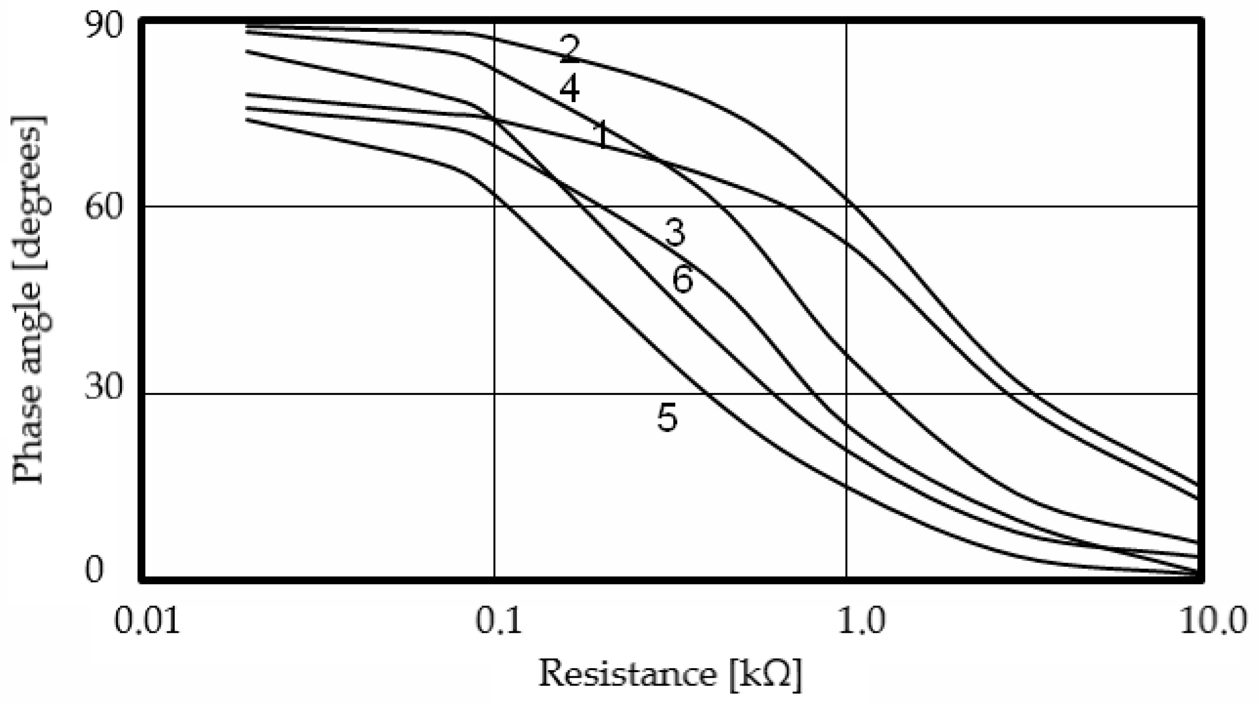 As the transient resistance increases to the range of 0.1–1.0 kΩ, the phase angle gradually decreases to 210–240°, reflecting the transition from a capacitive to a mixed resistive–capacitive regime of current flow.