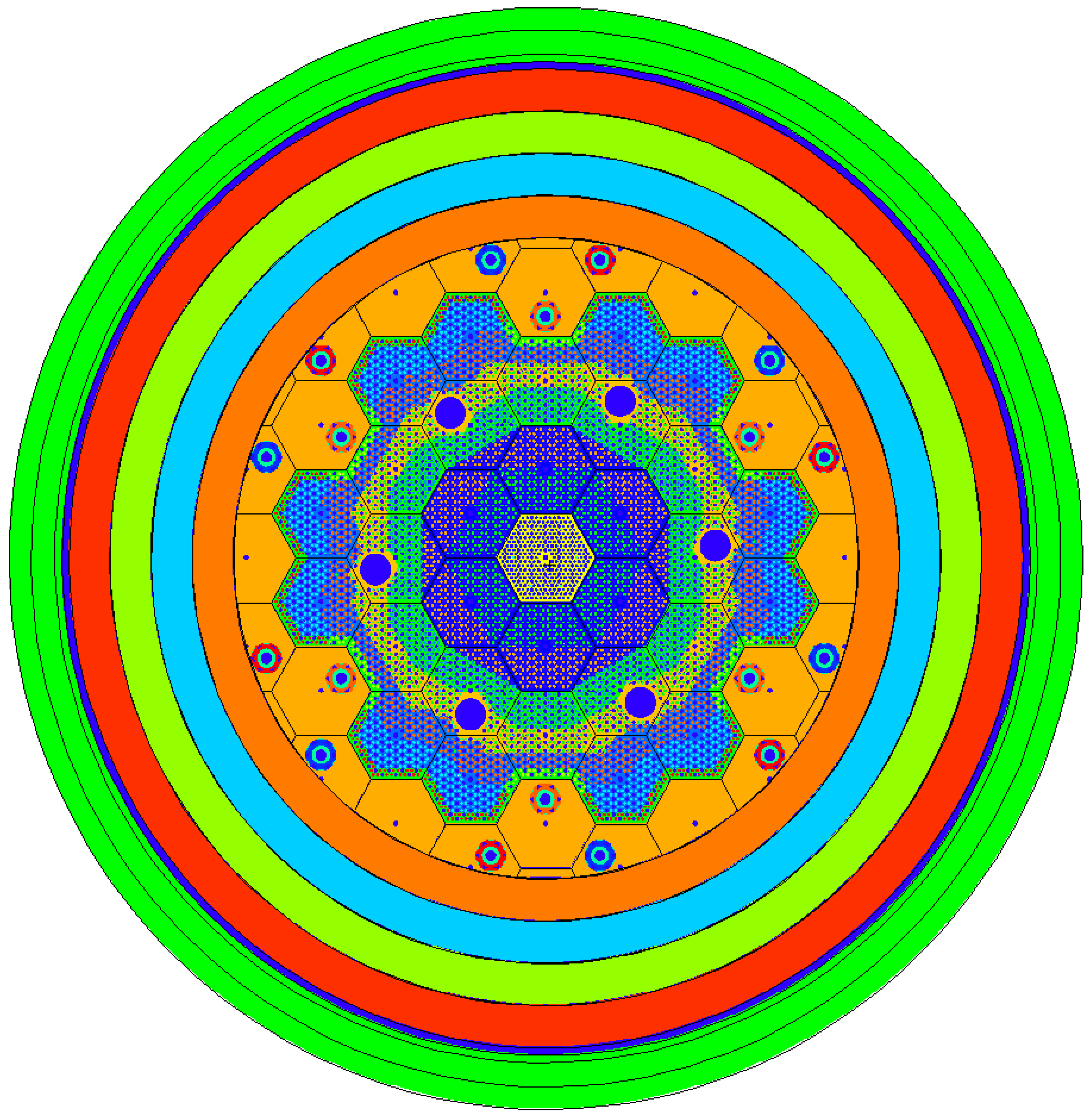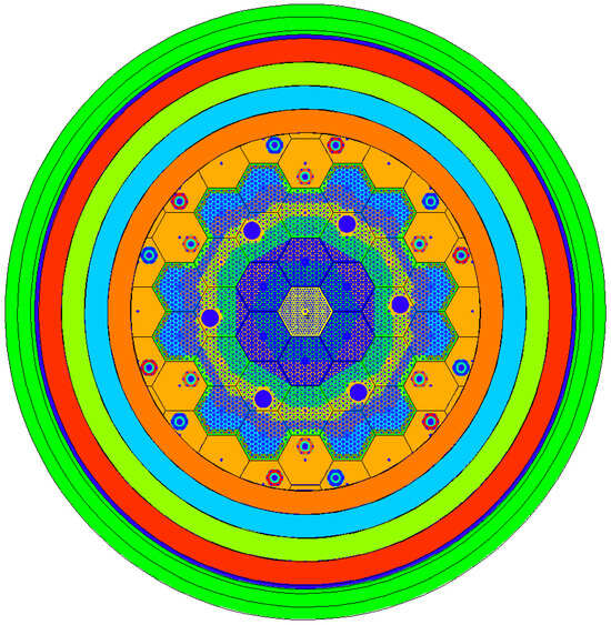 To reduce computational complexity while preserving neutronic fidelity, the reflector geometry was simplified by replacing individual graphite blocks with concentric rings of equivalent mass. This simplification does not affect the calculated neutron flux distributions or reactivity coefficients. Burnup zones were defined independently of the block structure, allowing for finer control of depletion effects without increasing geometric complexity. The general cross section of the reactor with a bigger core diameter (version V1 and V2) divided into burnup zones (marked with different colors) is shown in Figure 1. In the core of the third version—V3—the reflector expands for the entire 3-th ring and all CRs are located in blocks of 4-th ring.