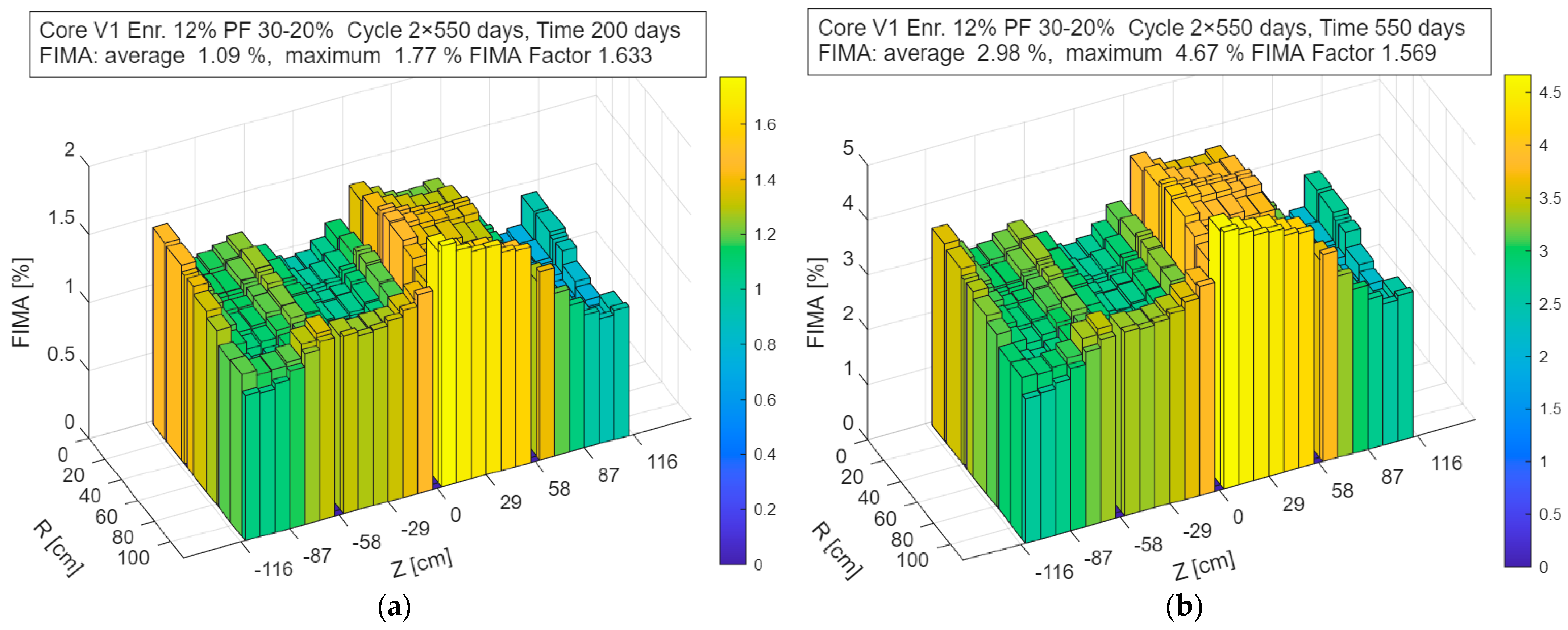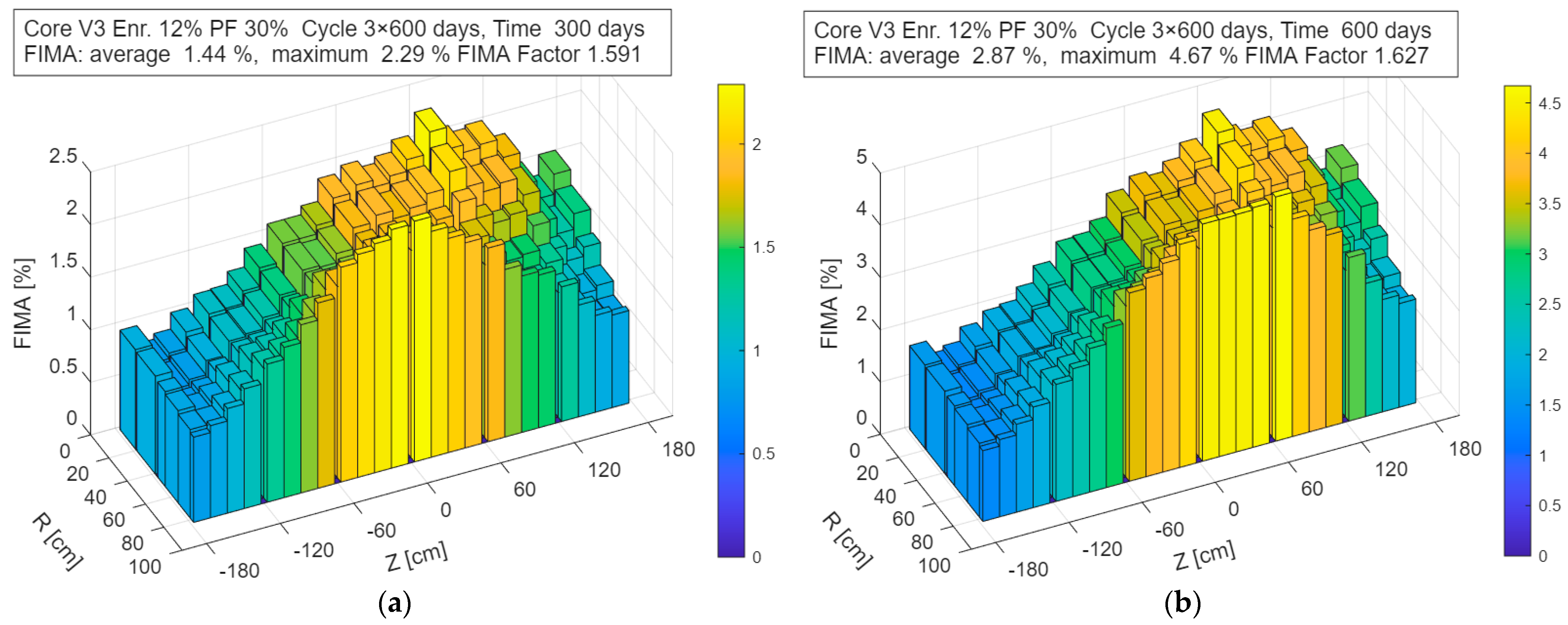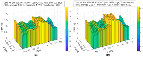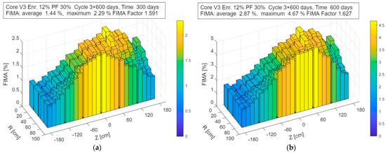 Figure 9 shows the corresponding evolution of the cumulative FIMA after 300 and 600 days of operation. The FIMA values shown in the figures correspond to a single sub-cycle. To obtain the final FIMA for the discharged fuel, these values must be integrated over the entire cycle, i.e., multiplied by the number of refueling steps applied in the fuel management strategy.