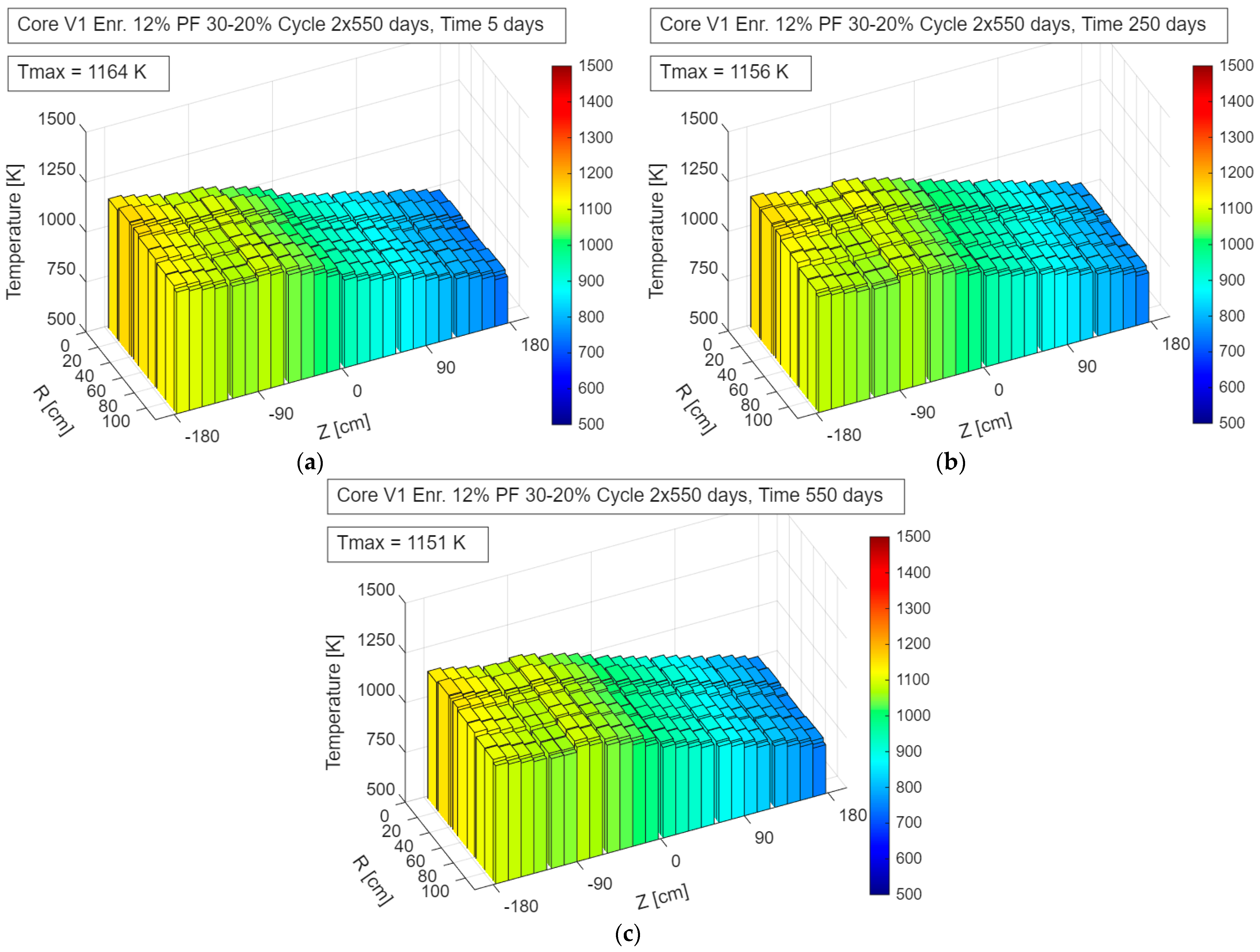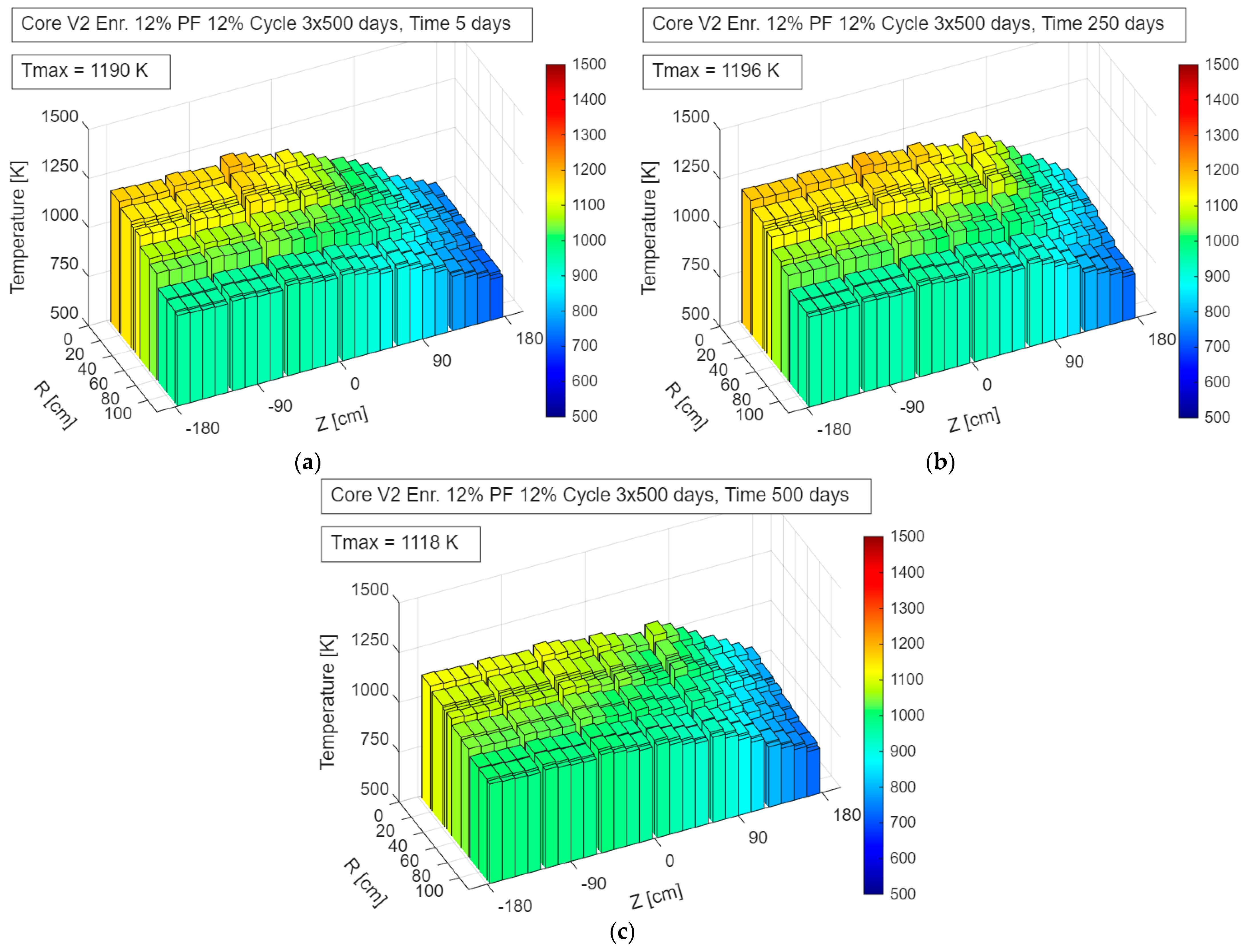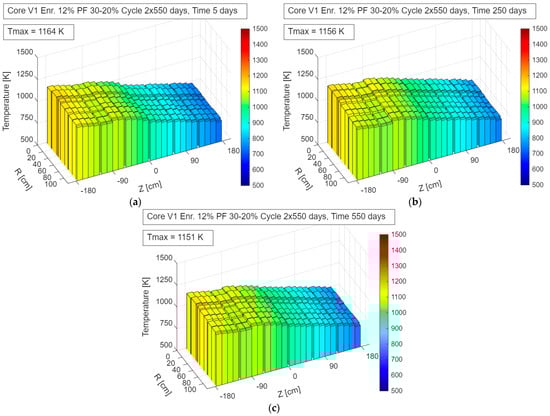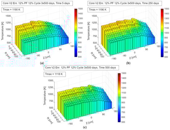 Fuel temperature distribution in the V2_En12%_Pf12% configuration during operation—up to 500 days: (a) 5 days; (b) 250 days; (c) 500 days.