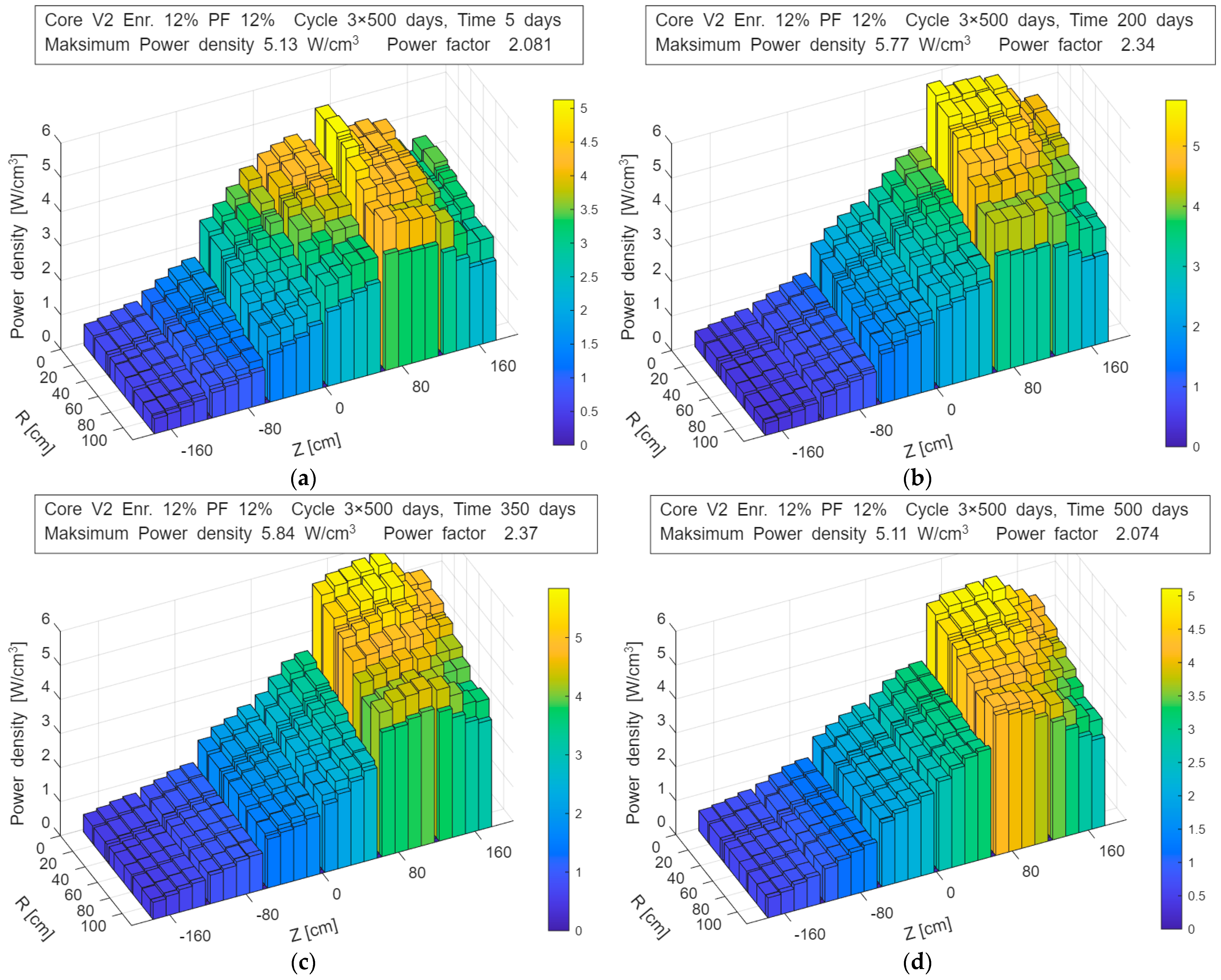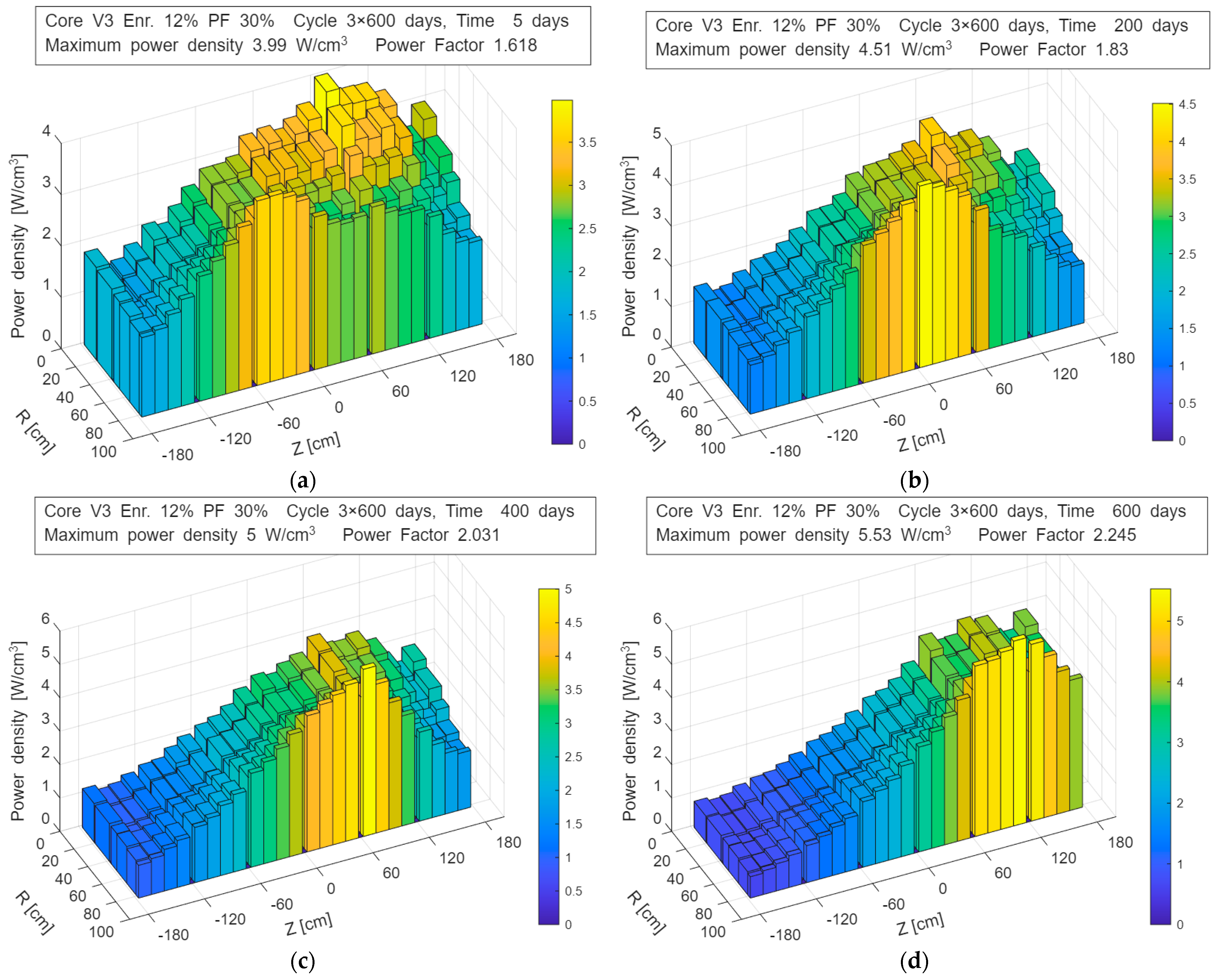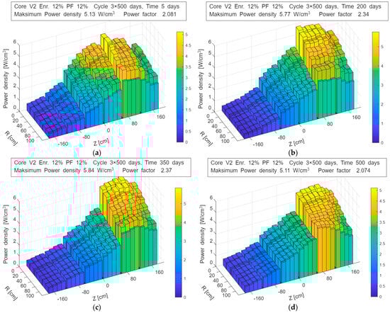 Evolution of the power density distribution in the V2_En12%_Pf12% configuration during operation—up to 550 days: (a) 5 days; (b) 200 days; (c) 350 days; (d) 550 days.