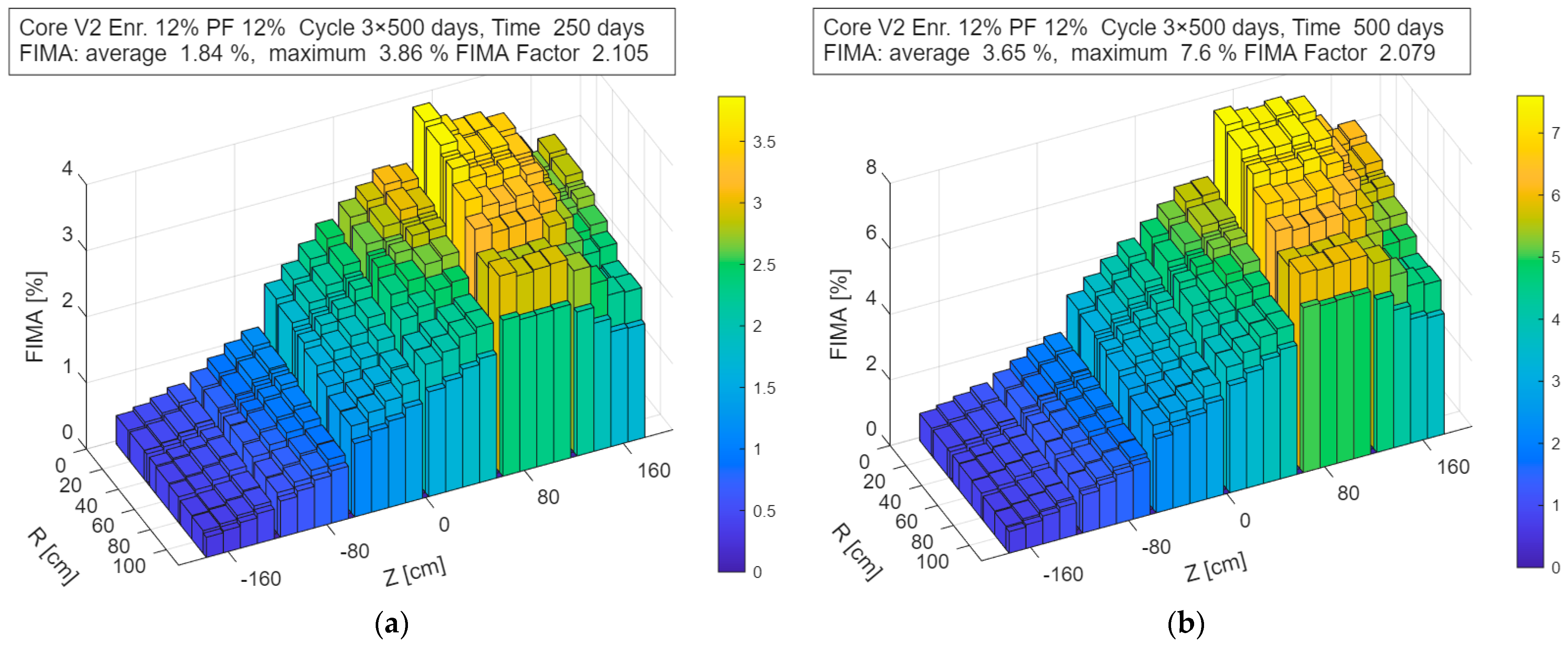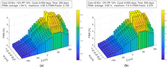 Figure 6 shows the corresponding evolution of the cumulative FIMA after 250 and 500 days of operation. The FIMA values shown in the figures correspond to a single sub-cycle. To obtain the final FIMA for the discharged fuel, these values must be integrated over the entire cycle, i.e., multiplied by the number of refueling steps applied in the fuel management strategy.