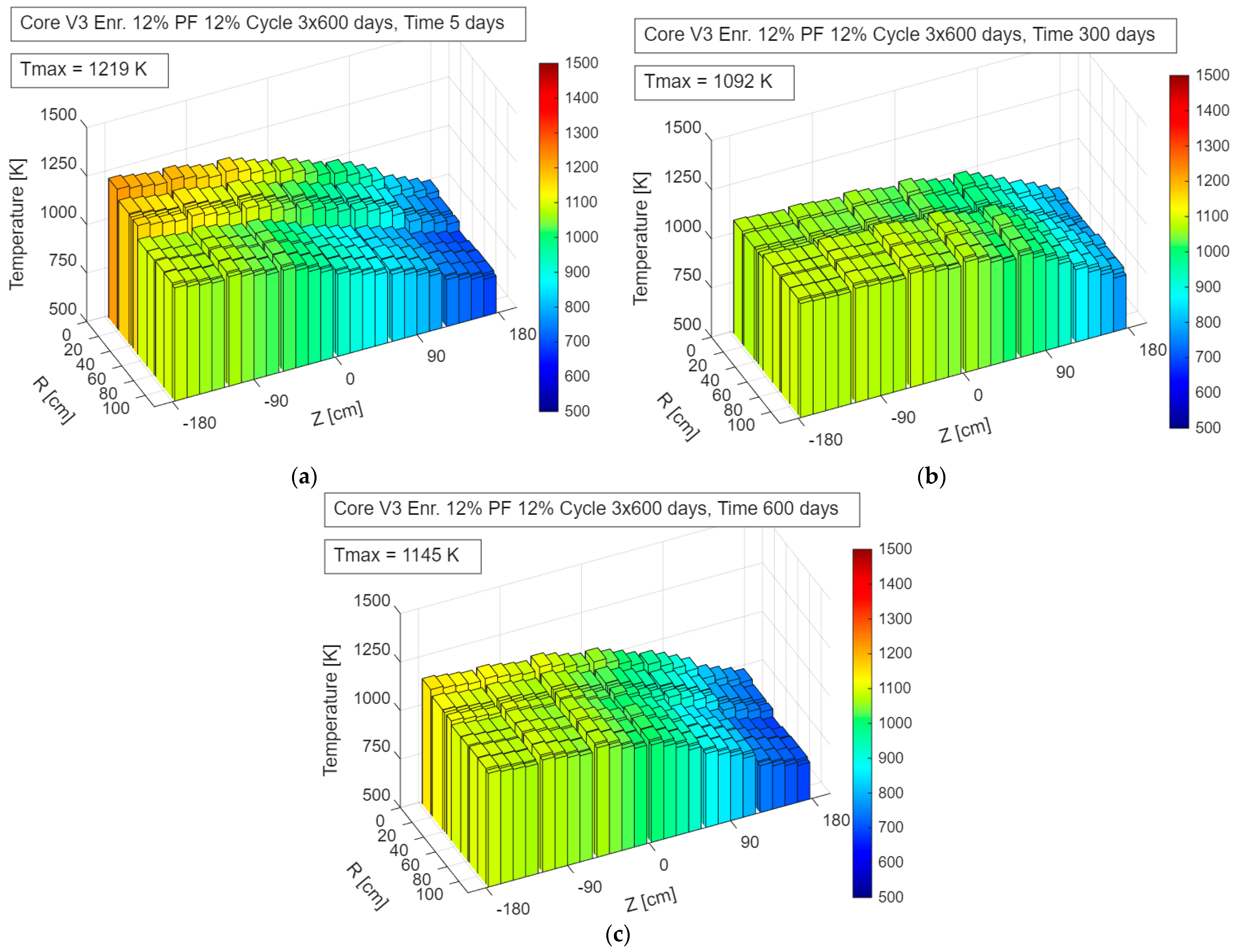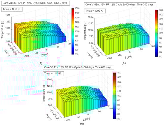 Fuel temperature distribution in the V3_En12%_Pf12% configuration during operation—up to 600 days: (a) 5 days; (b) 300 days; (c) 600 days.