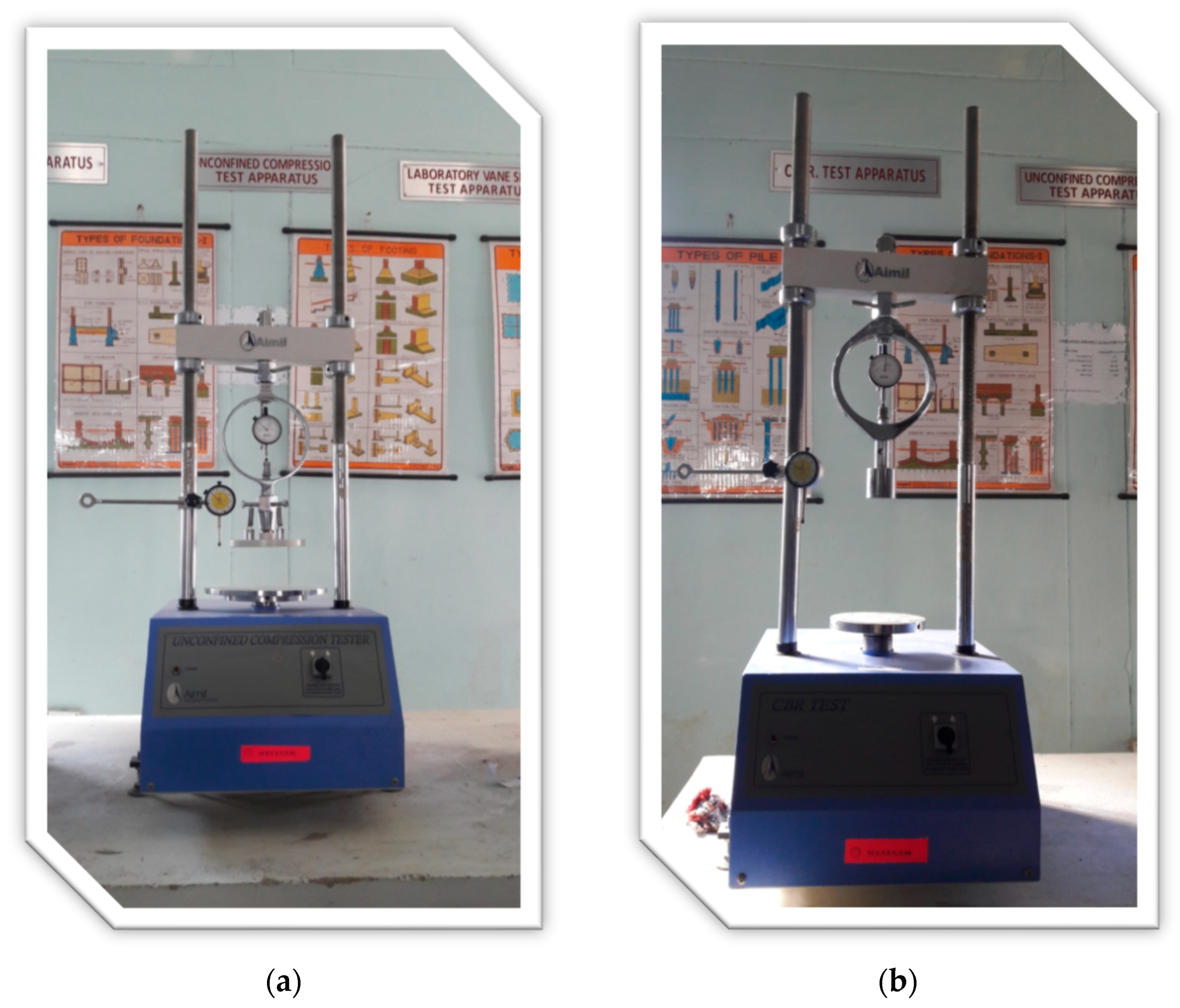 11], because DFSI reflects inherent swell potential rather than time-dependent strength gain. The strain rate for UCS testing was maintained at 1.25 mm/min. For all UCS, CBR, and DFSI tests, three parallel specimens (n = 3) were prepared and tested. The mean and standard deviation values are reported in the Results section. All test results represent mean values based on triplicate specimens to ensure accuracy and reproducibility. The laboratory setups for both the Unconfined Compressive Strength (UCS) test and the California Bearing Ratio (CBR) test are shown in