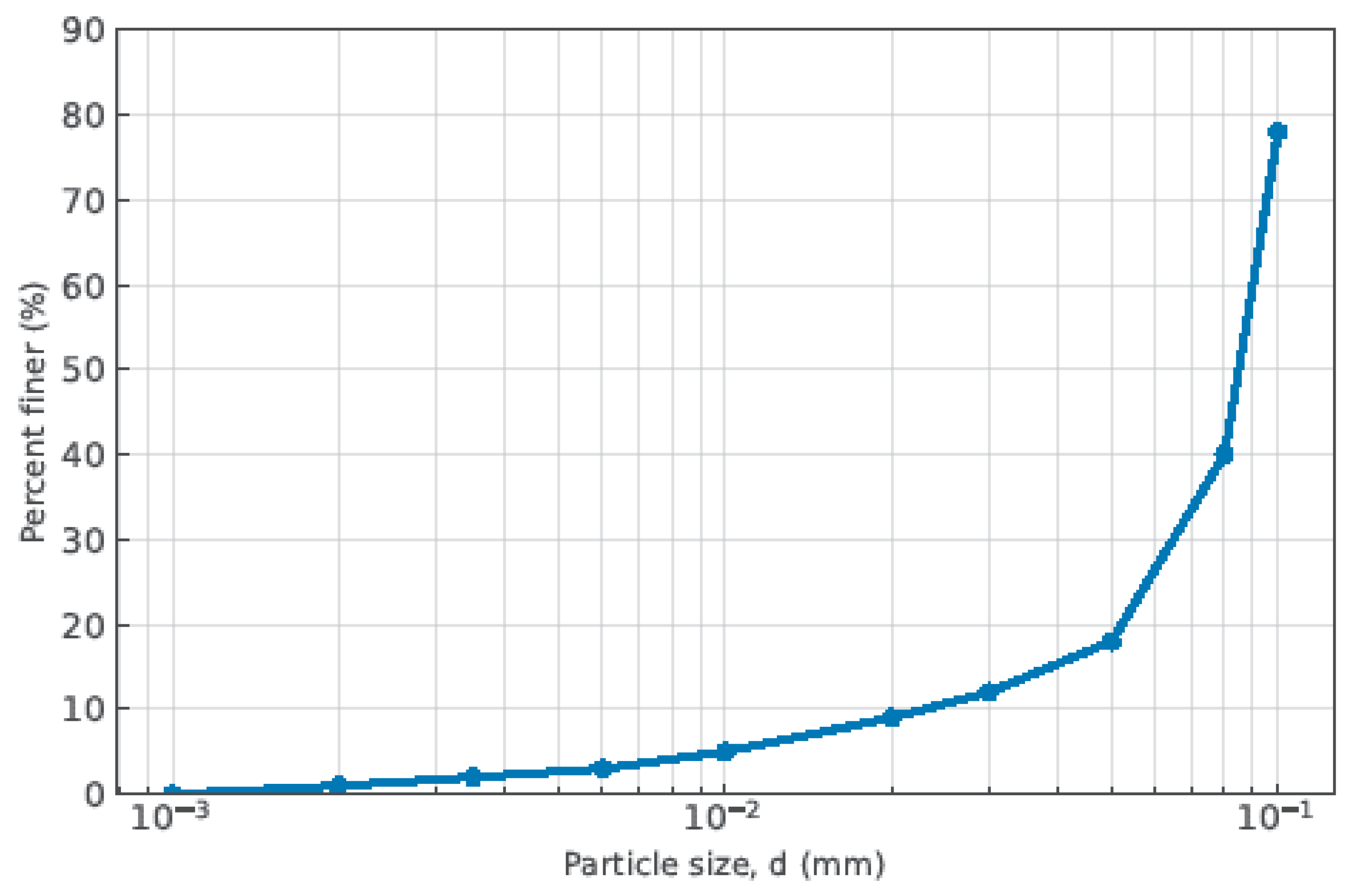 12], revealed that the majority of the particles were distributed in the 10–80 µm range, corresponding to the silt to fine-silt fraction, which enhances reactivity and blending behaviour in soil matrices. X-ray diffraction (XRD) confirmed the predominantly amorphous structure of the material, which is favourable for pozzolanic activity when used as a stabiliser.