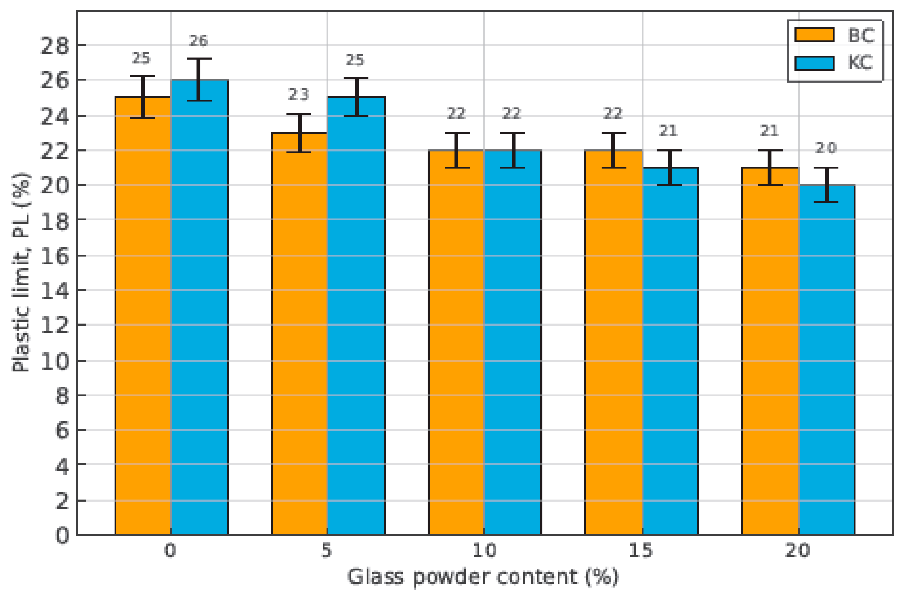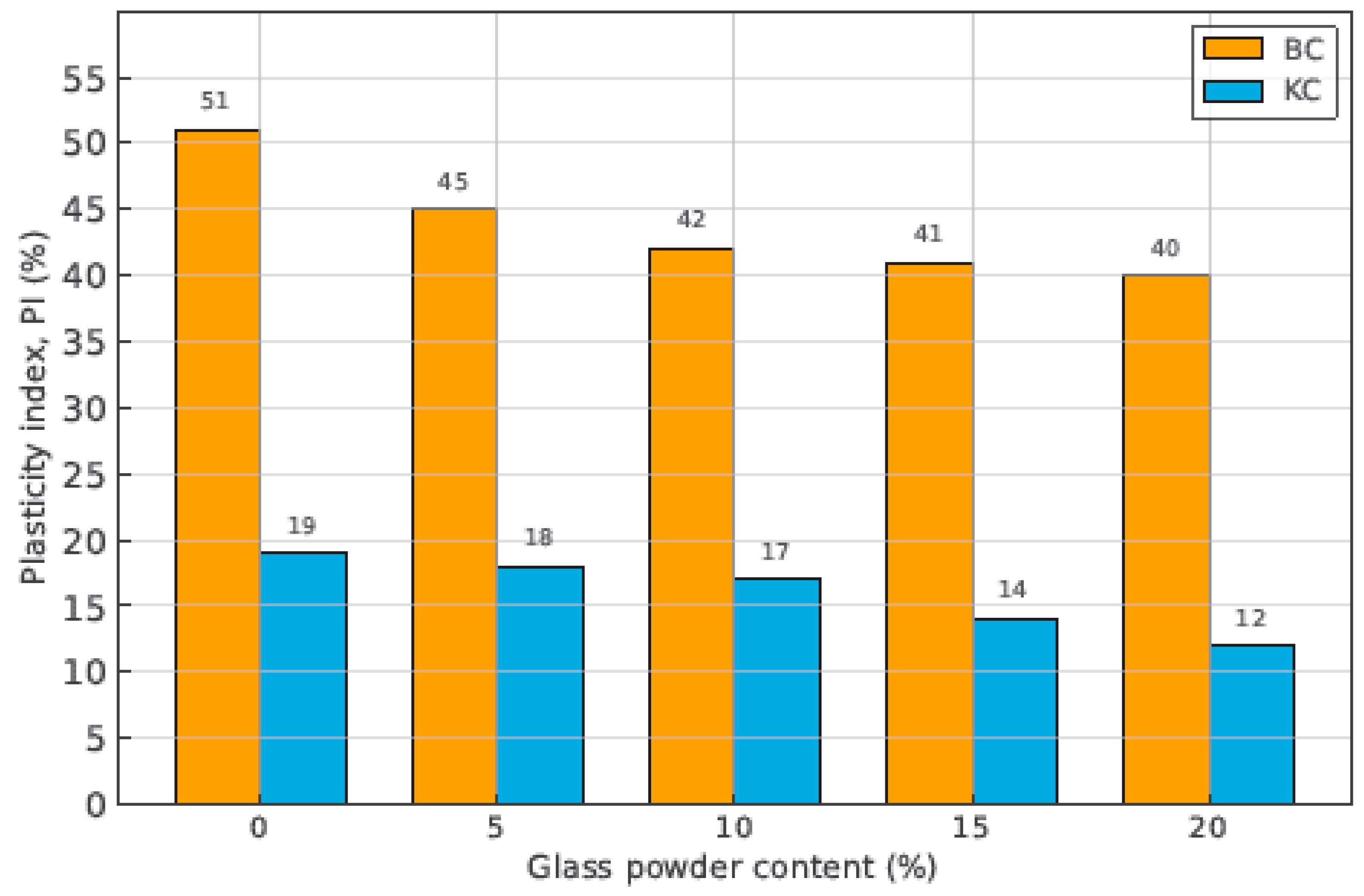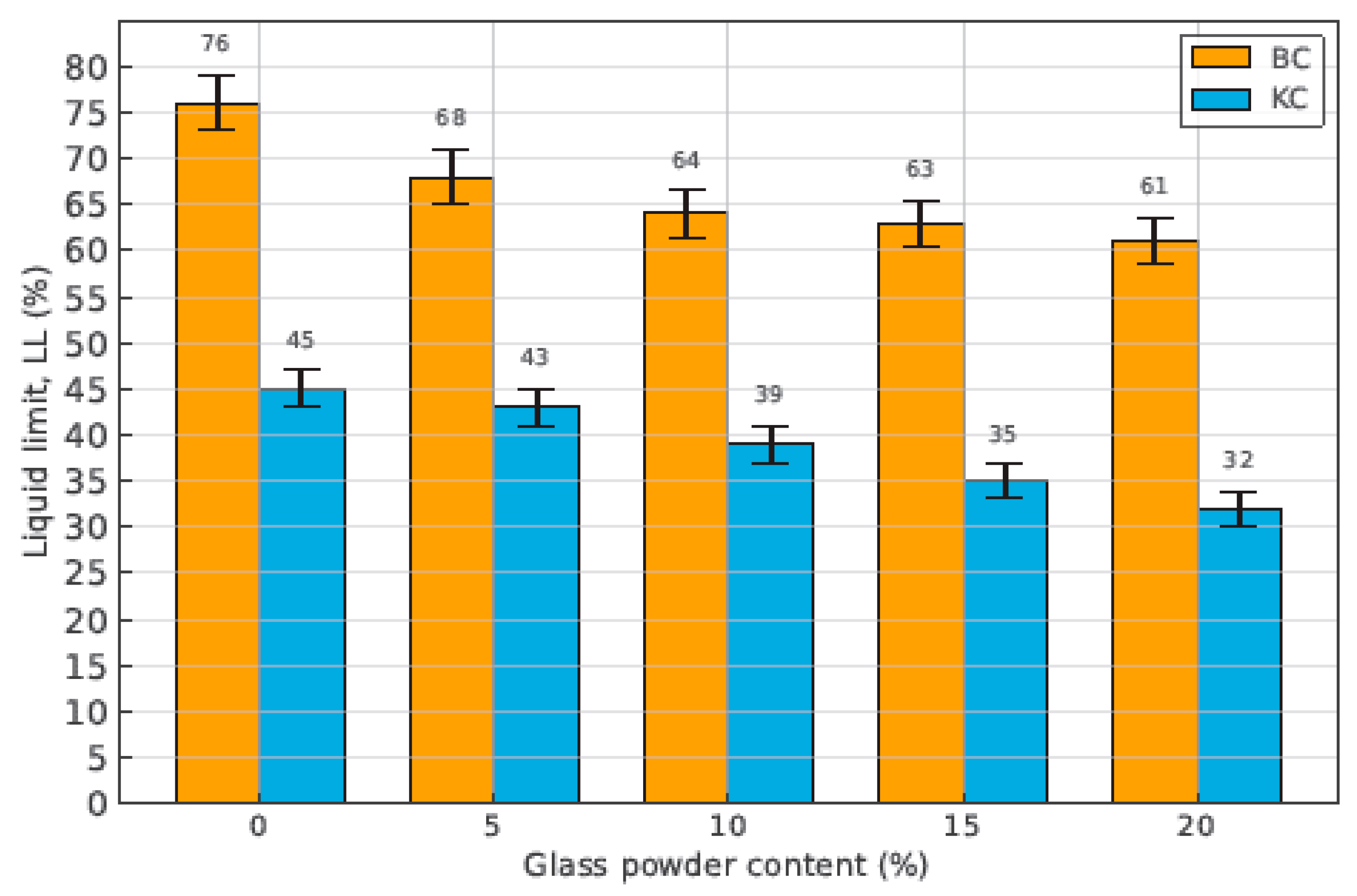For BC soil, characterised by high initial plasticity due to the predominance of montmorillonitic minerals, the LL decreases from 76% at 0% GP to 61% at 20% GP. This reduction (~20%) aligns with previously reported values for expansive soils stabilised using finely ground inert materials such as waste glass, fly ash, and quarry dust [