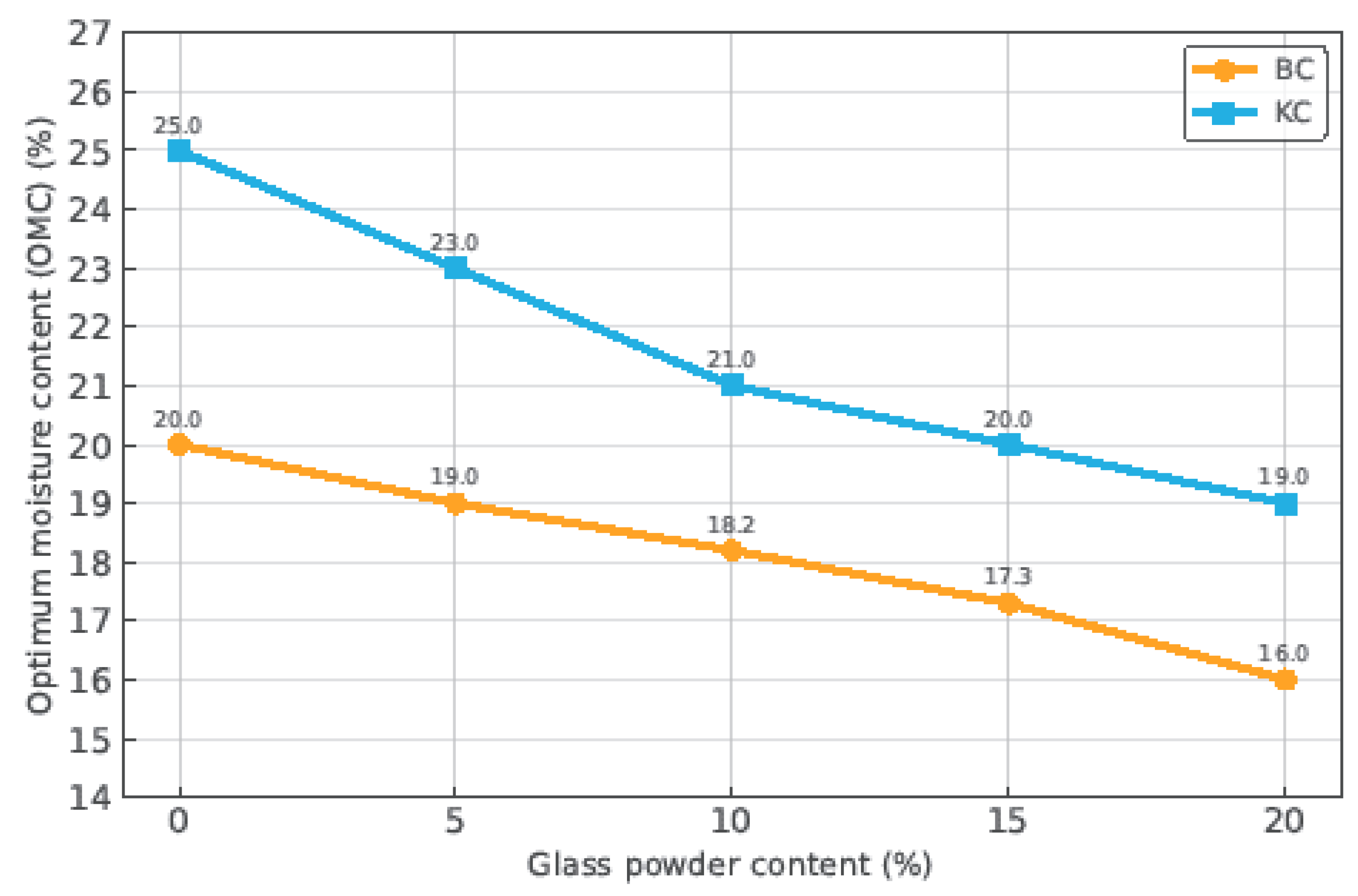 Figure 9 clearly demonstrate that the incorporation of glass powder (GP) has a pronounced influence on the plasticity characteristics of both Black Cotton (BC) soil and Kaolinite Clay (KC). A systematic and monotonic reduction in the liquid limit (LL) and plasticity index (PI) is observed with increasing GP content, while plastic limit (PL) shows only marginal variation. This trend is attributed primarily to the inert and non-plastic nature of GP, which dilutes the active clay mineral fraction, thereby reducing the soil’s capacity to absorb and retain water within its diffuse double layer.