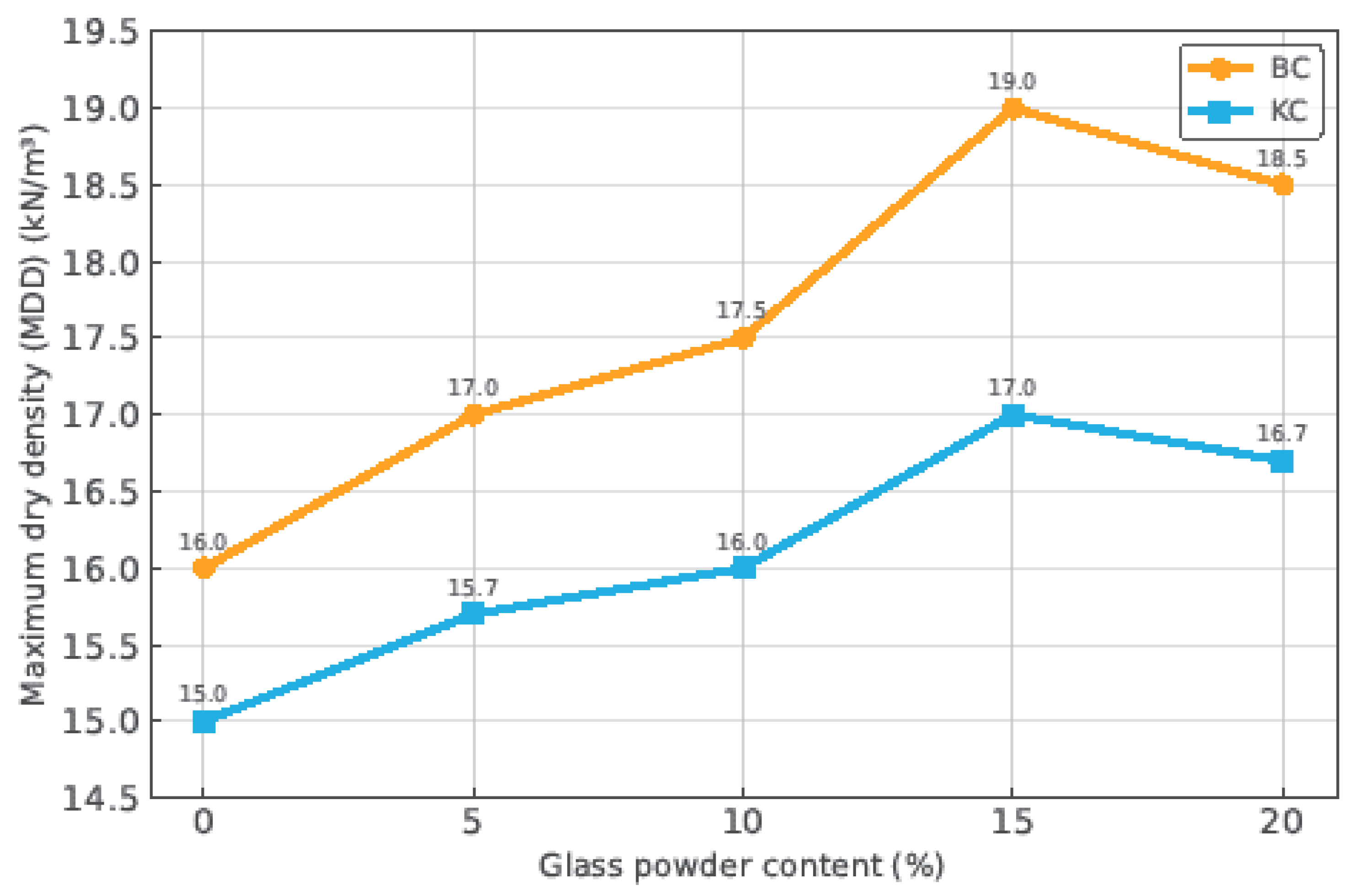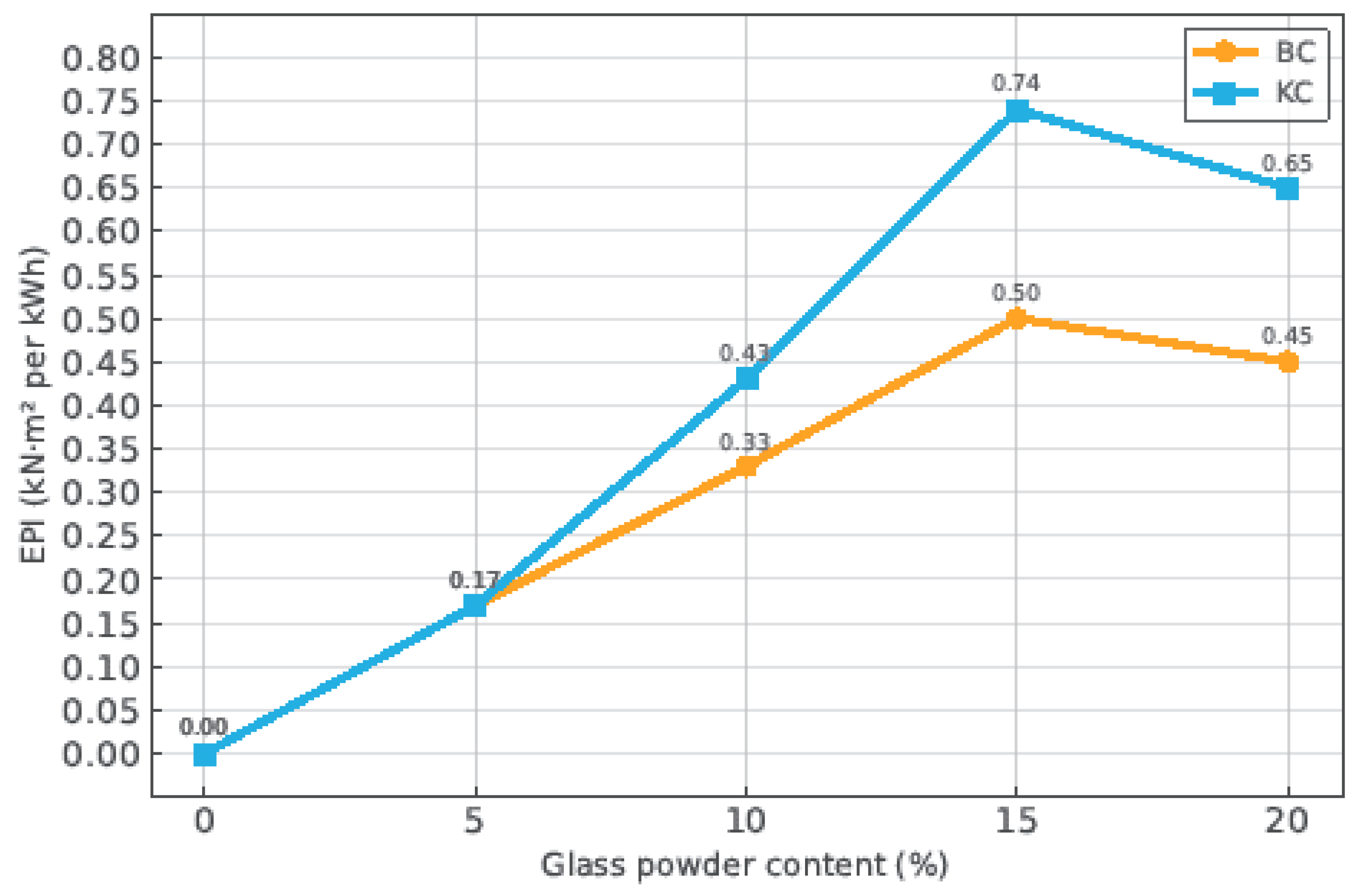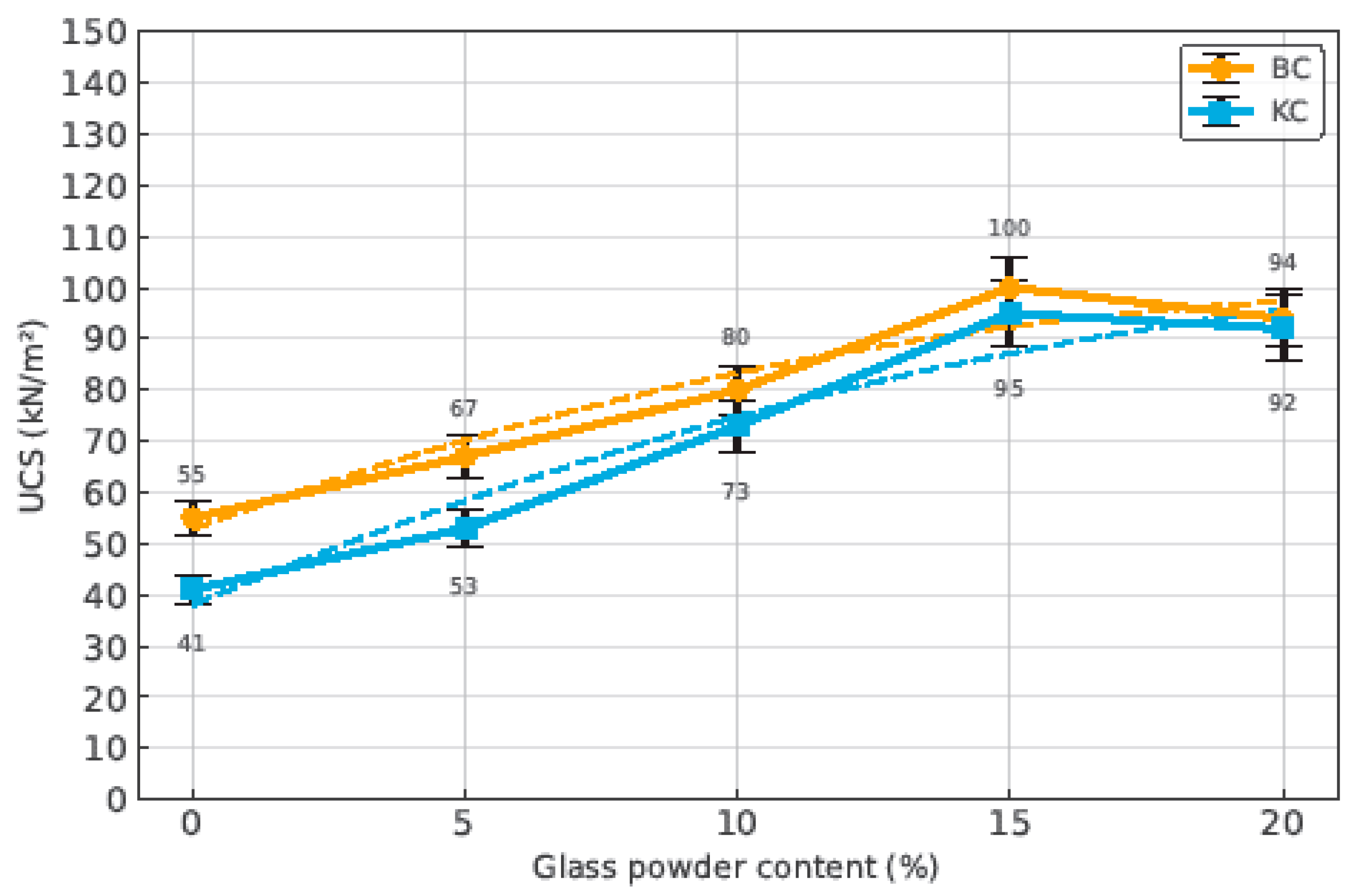 The slight decline in UCS beyond 15% GP suggests that excessive replacement may disrupt the clay fabric and reduce cohesive bonding between particles, leading to reduced load transfer efficiency. Nonetheless, the overall improvement—from 55 kN/m2 to 95 kN/m2 in BC and from 41 kN/m2 to 100 kN/m2 in KC—represents a substantial enhancement in strength with minimal embodied energy input. This is particularly significant when viewed through the lens of energy efficiency. Since GP is a recycled by-product with low production energy, the observed gains correspond to a high Energy Performance Index (EPI), representing greater strength gain per unit of energy invested. Moreover, the lower optimum moisture content and higher dry density achieved at the same GP levels reduce energy requirements during mixing and compaction, further improving sustainability.