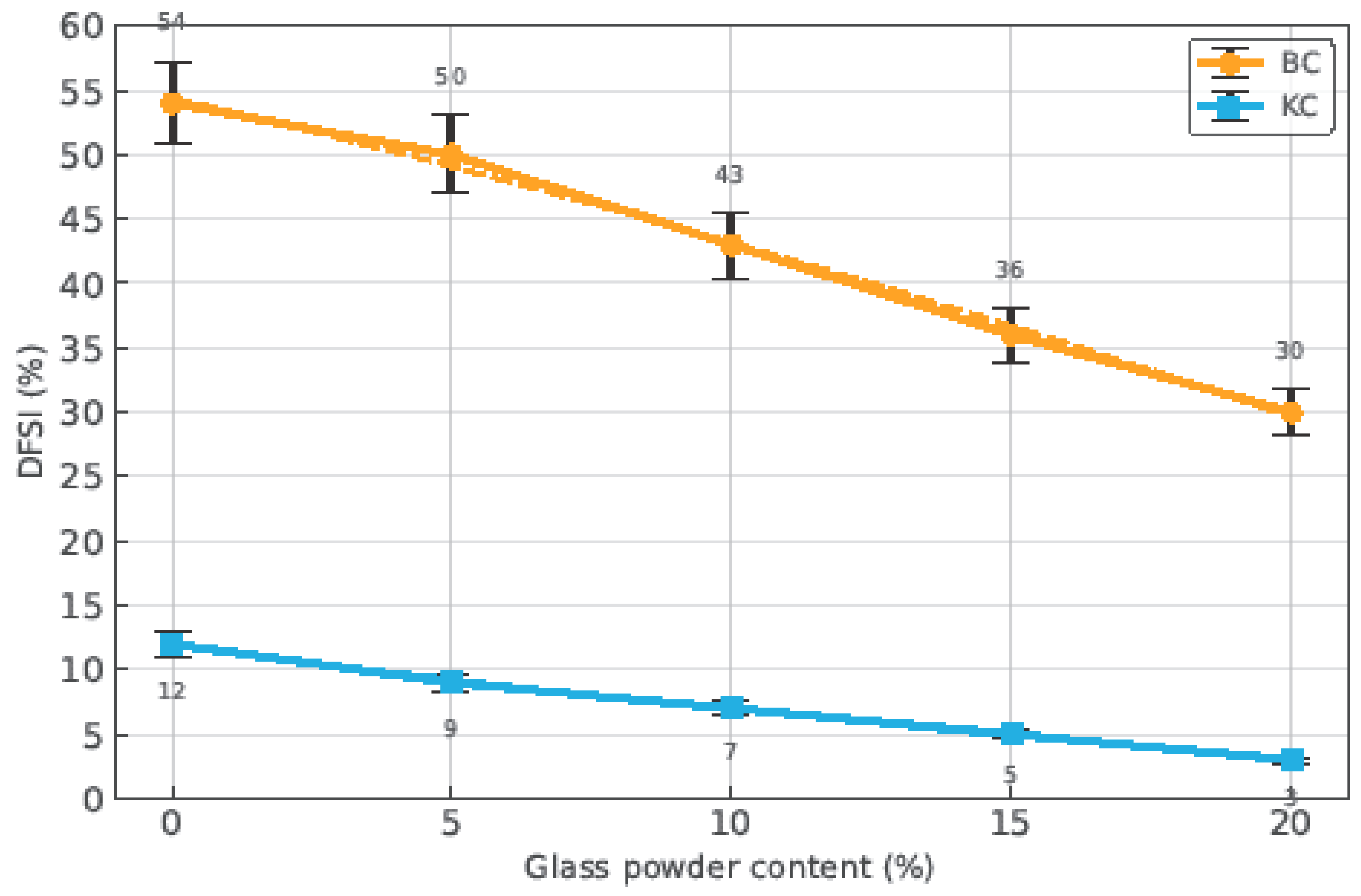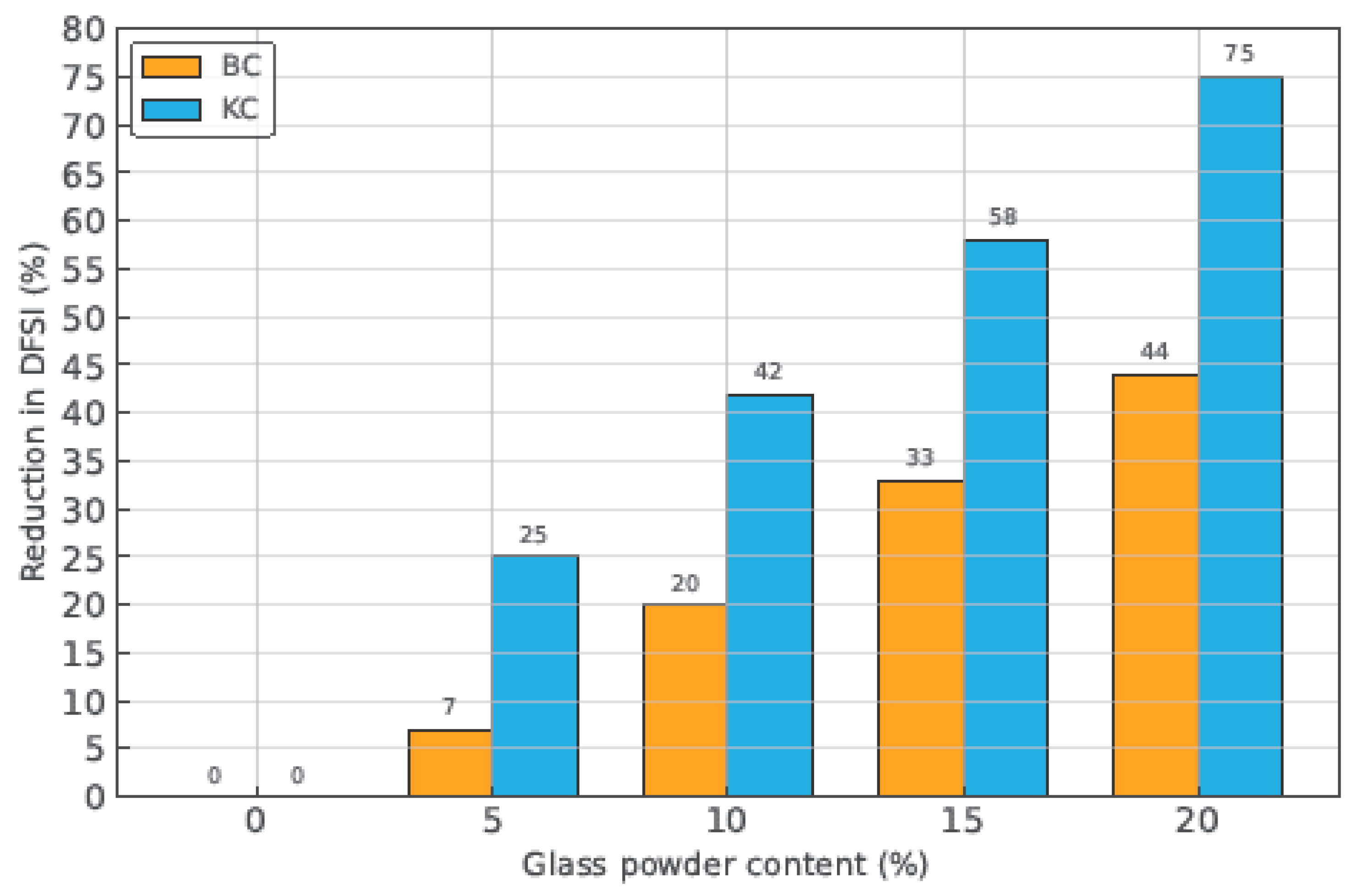 Figure 15 clearly demonstrates that at a 20% GP, the DFSI reduction reached approximately 45% for BC and 75% for KC relative to the untreated baseline. This level of improvement is comparable to reductions achieved with fly ash, slag, and other supplementary binders reported in recent studies [
