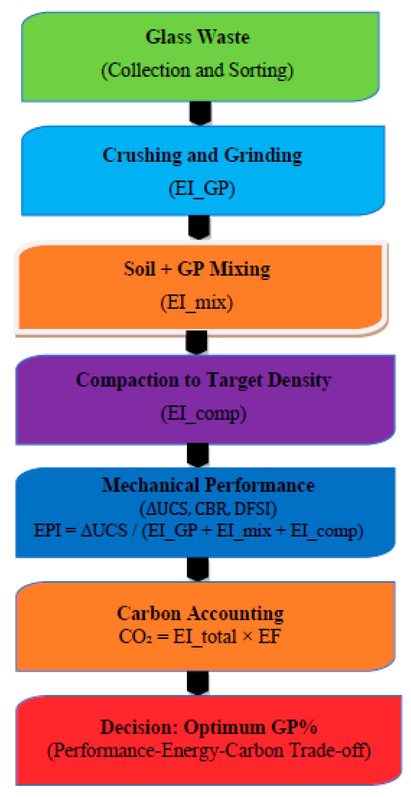 A key objective of this study was to establish a quantitative relationship between mechanical enhancement and energy consumption associated with the use of waste glass powder (GP) as a sustainable soil stabiliser. This dual framework allows performance-based design decisions to be coupled with energy efficiency and carbon accounting, thereby supporting low-energy ground improvement strategies in mining and infrastructure projects.