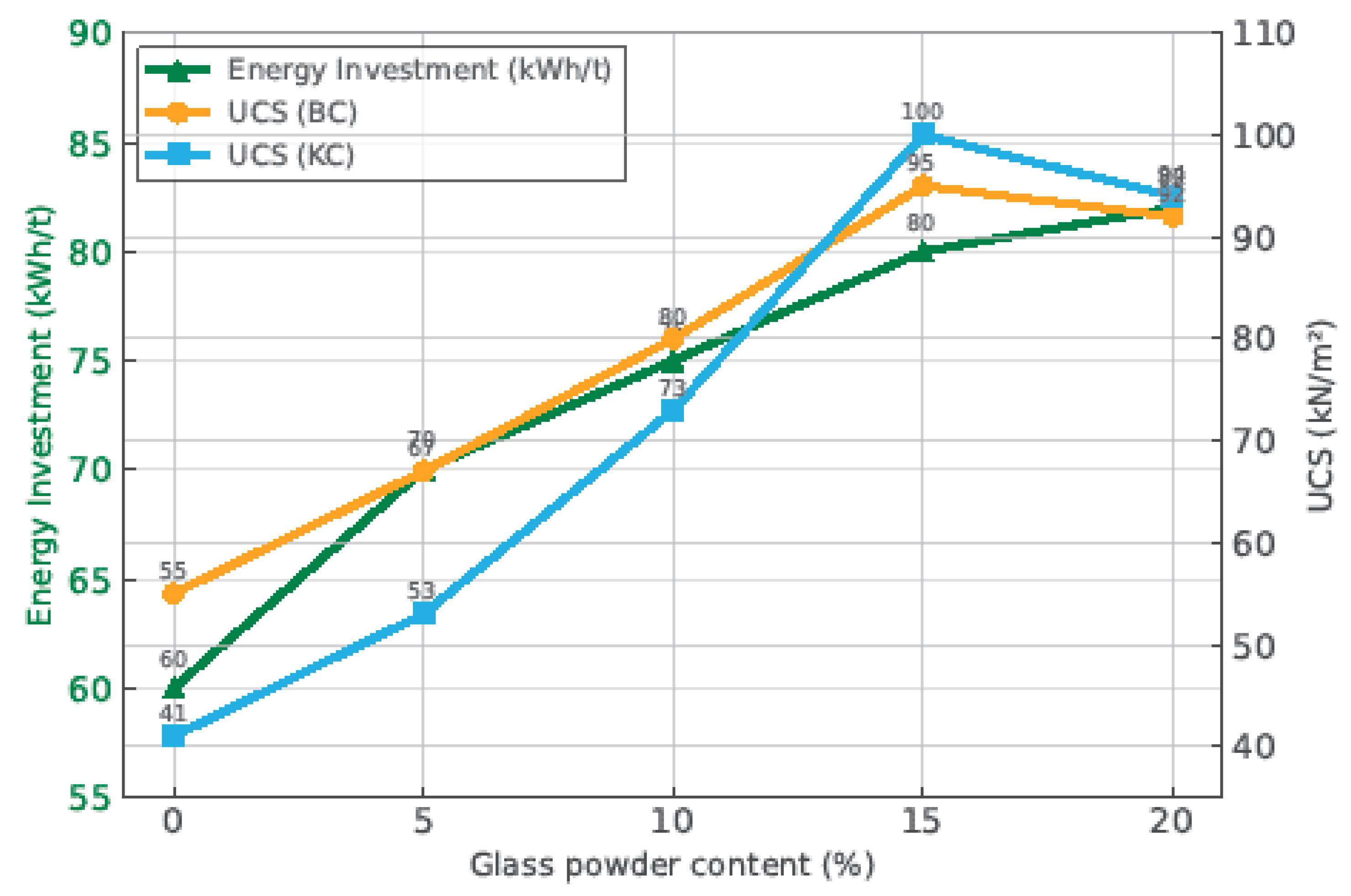 A Key objective of this study was to establish a direct relationship between mechanical performance improvements and the energy consumption associated with material production and stabilisation activities. Strength–dosage curves were developed to evaluate the response of the soil to varying levels of glass powder (GP), allowing identification of the optimum GP content that delivers the most significant strength enhancement per unit of energy invested. The total Energy Investment (EI) for GP-stabilised mixes was computed by summing the energy required for (i) crushing and grinding during GP production (kWh per tonne of material), (ii) mixing and compaction per unit volume of treated soil, and (iii) the comparative baseline energy required to achieve equivalent strength using conventional stabilisers such as cement or lime [