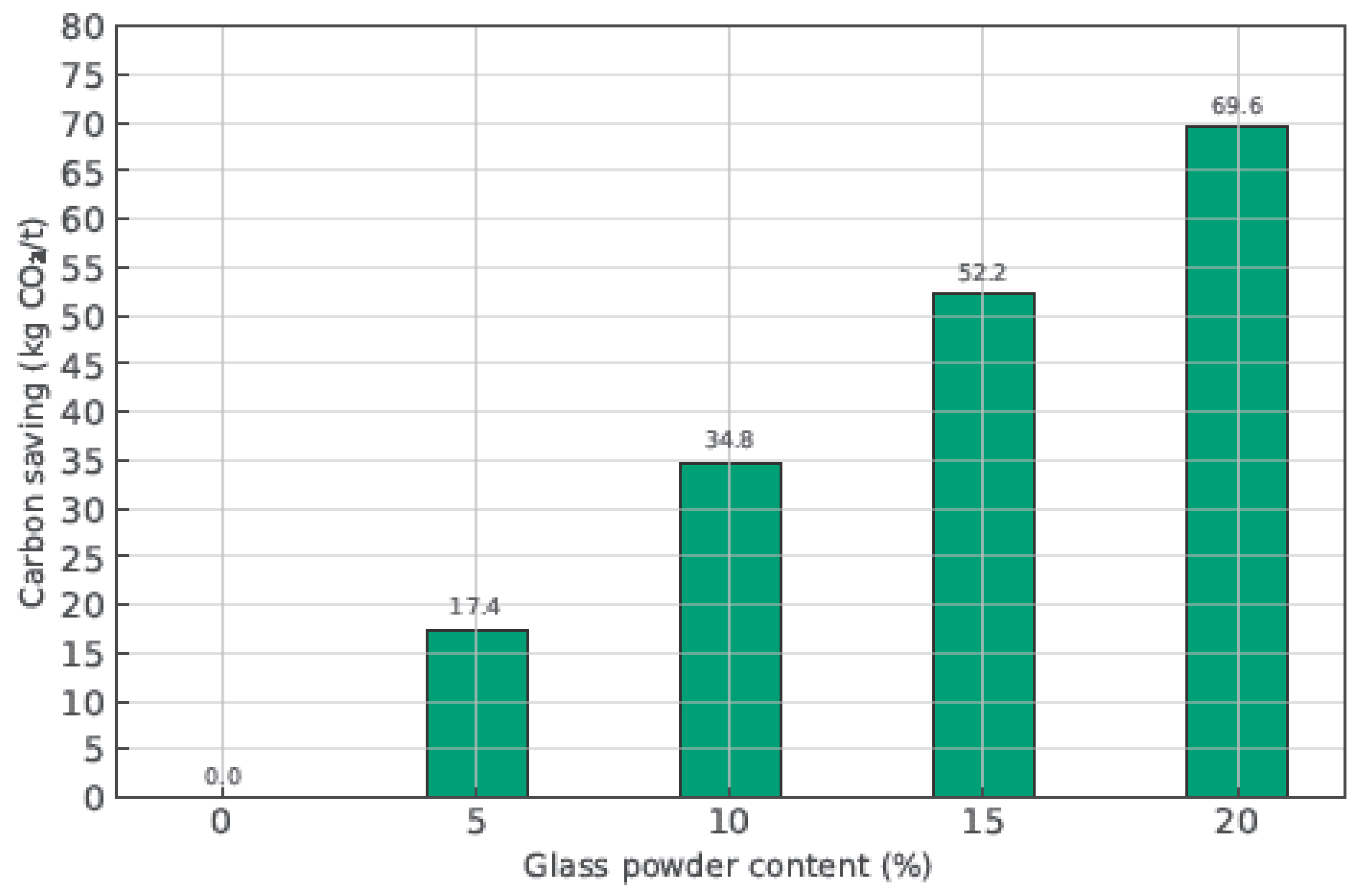 Typical values from industrial and academic databases were considered for energy factors. Cement production typically consumes 3.5–4.5 GJ/t, while glass powder production (crushing and grinding) requires approximately 0.5–0.6 GJ/t [