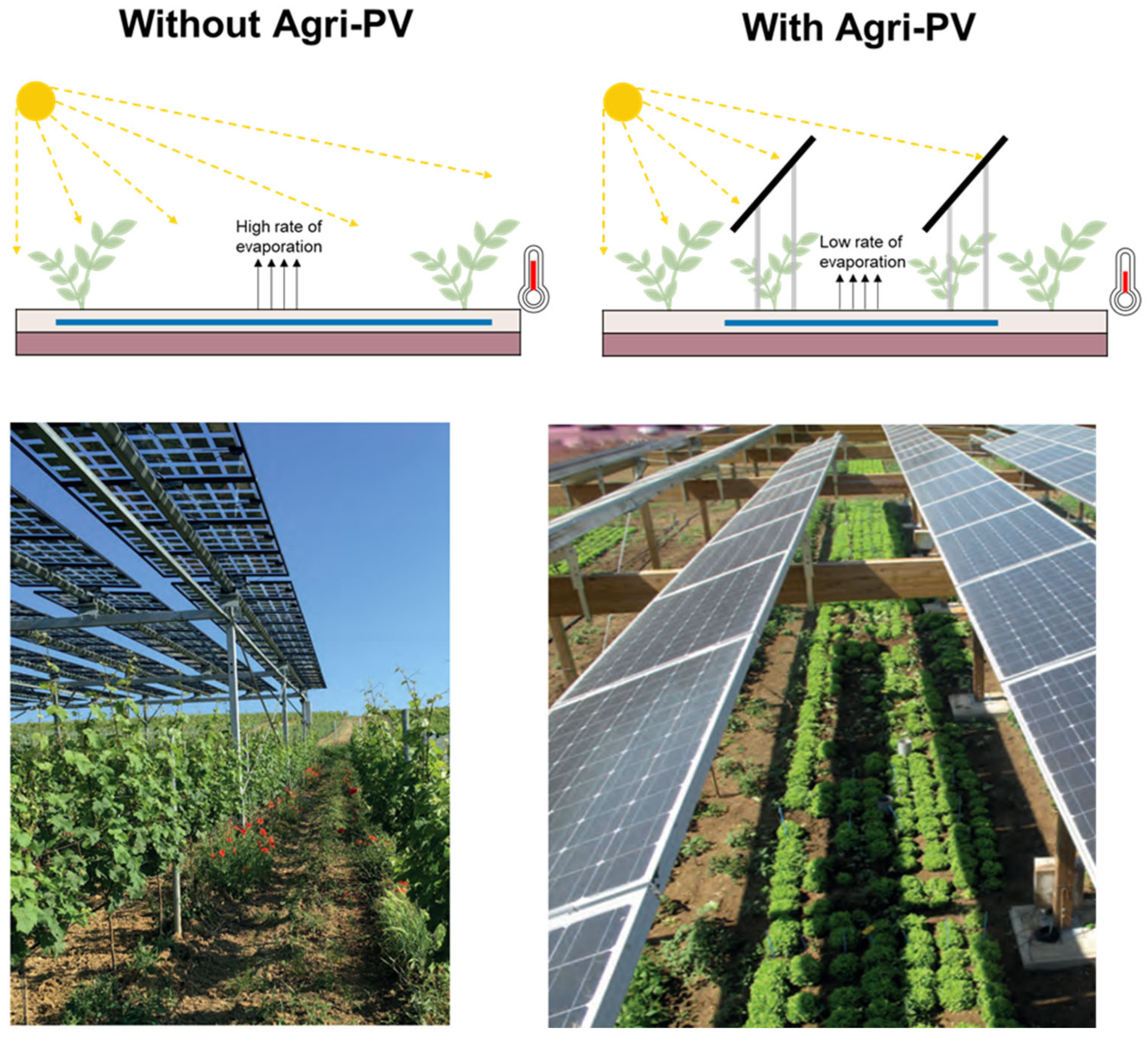 - Widmer, J.; Christ, B.; Grenz, J.; Norgrove, L. Agrivoltaics, a promising new tool for electricity and food production: A systematic review. Renew. Sustain. Energy Rev. 2024, 192, 114277. [Google Scholar] [CrossRef]