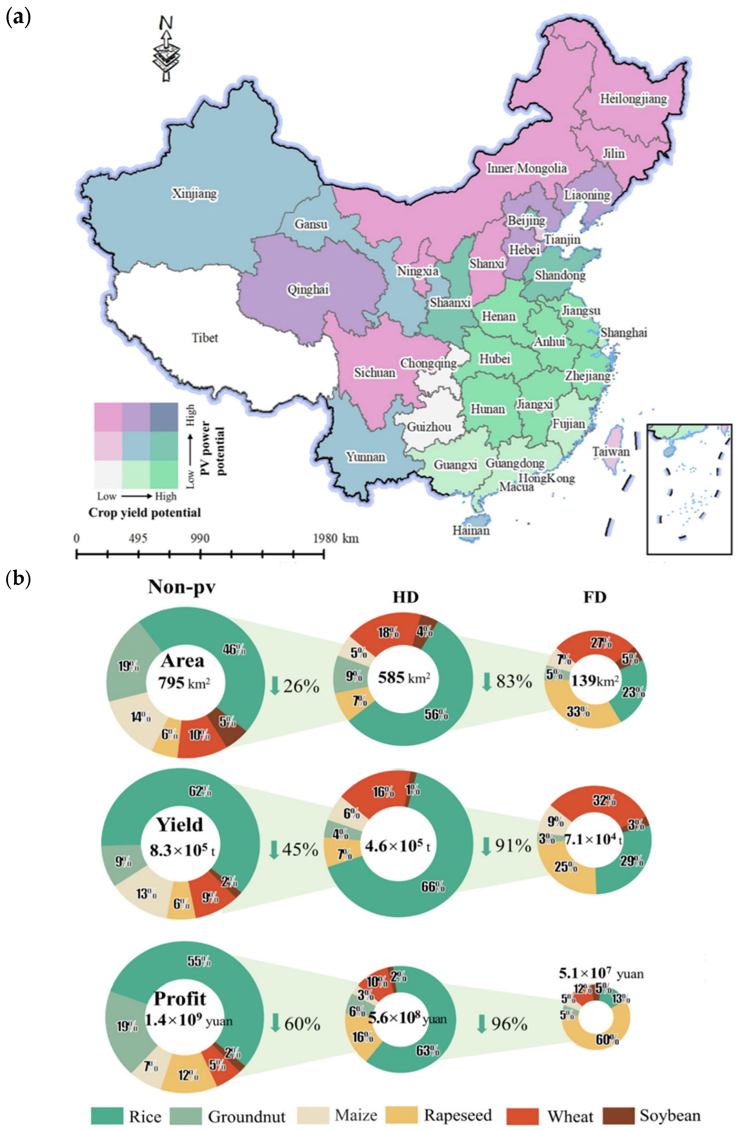 - Xia, Z.; Li, Y.; Guo, S.; Jia, N.; Pan, X.; Mu, H.; Chen, R.; Guo, M.; Du, P. Balancing photovoltaic development and cropland protection: Assessing agrivoltaic potential in China. Sustain. Prod. Consum. 2024, 50, 205–215. [Google Scholar] [CrossRef]