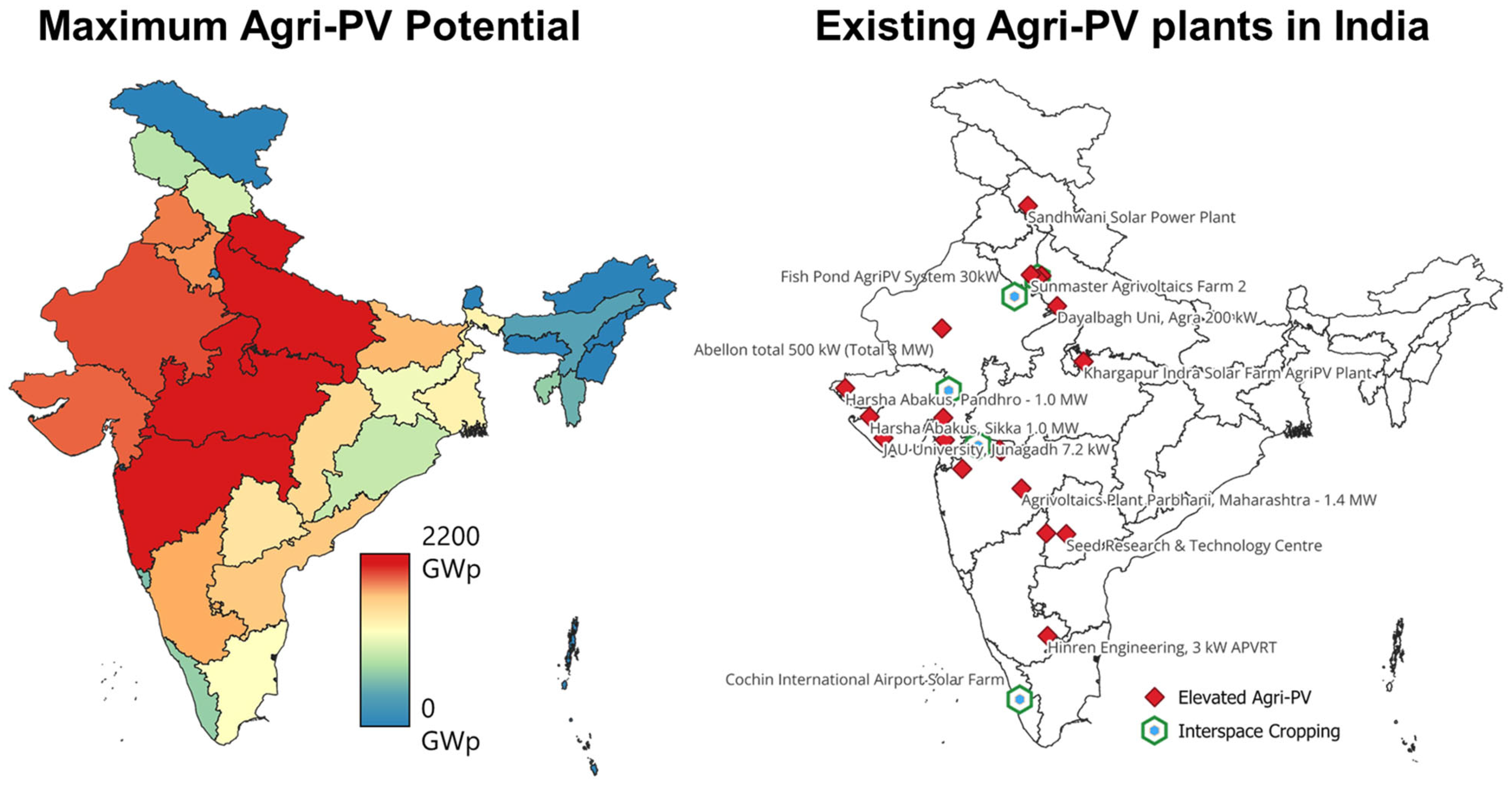 | India [61,167] | Emerging | 2012—first pilots (Maharashtra, Gujarat); 2021—Indo-German collaboration report | No explicit Agri-PV policy; included in MNRE consultations; NSEFI and IGEF reports recommend 15 GW target by 2030 |