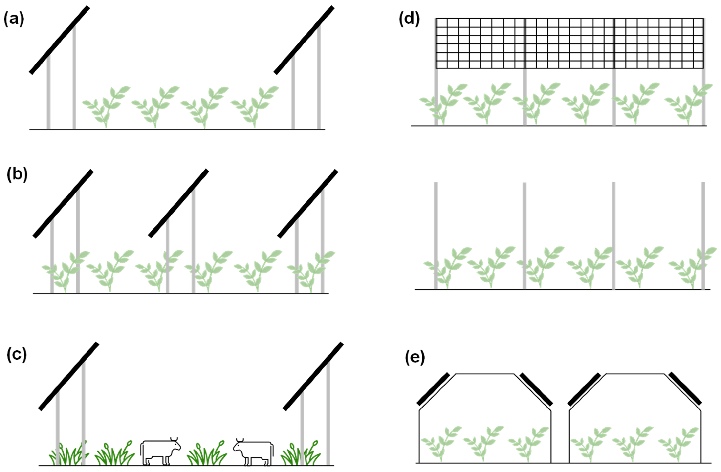 - Tan, Y.; Liu, J.; Li, W.; Yin, J.; Chen, H.; Peng, Y.; Tan, J.; Wei, M. Agrivoltaics development progresses: From the perspective of photovoltaic impact on crops, soil ecology and climate. Environ. Res. 2025, 266, 120540. [Google Scholar] [CrossRef]