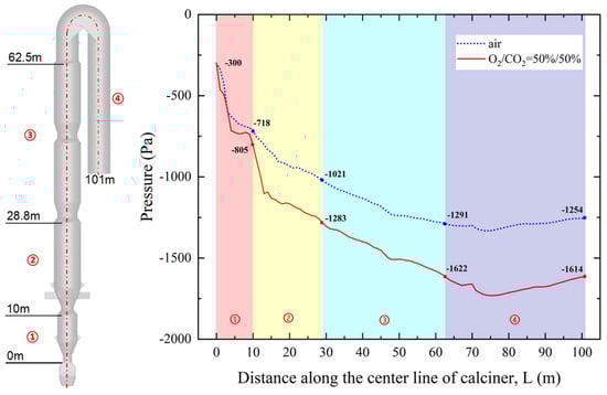 Comparison of pressure distribution along the calciner between oxy-fuel combustion and air combustion.