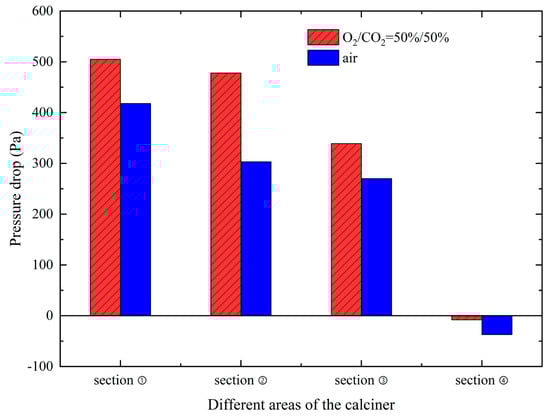 Comparison of pressure drop in different areas of the calciner between oxy-fuel combustion and air combustion.