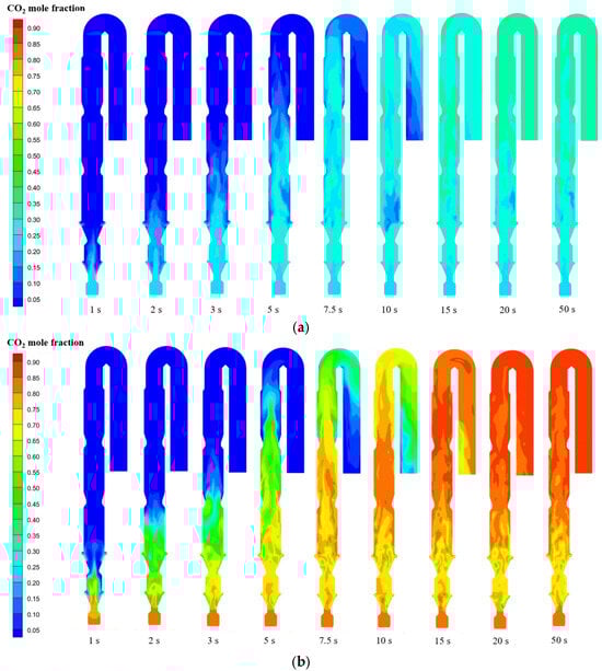 Temporal evolution of CO2 mole fraction in calciner: (a) air combustion; (b) oxy-fuel combustion.