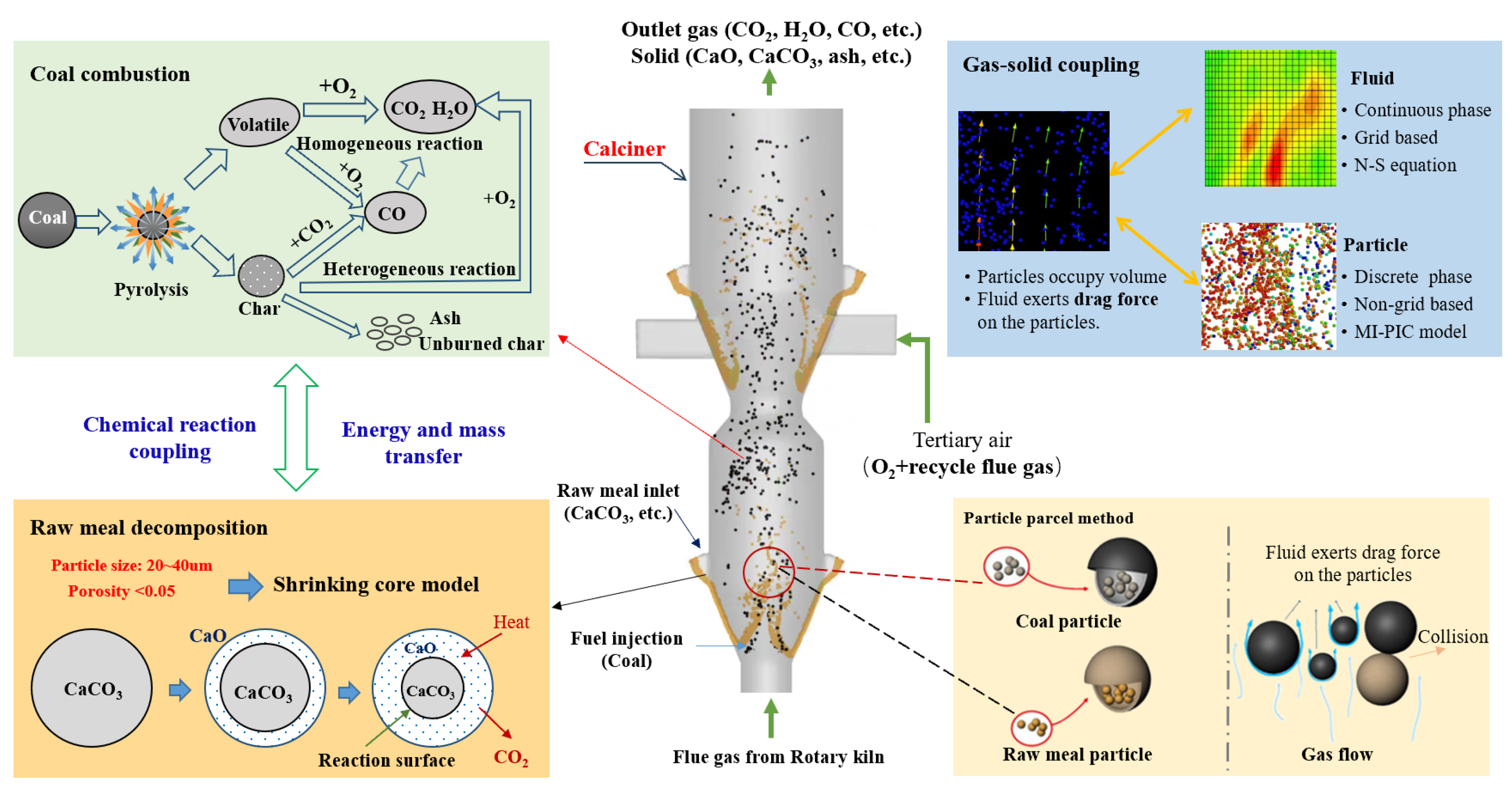 An oxy-fuel combustion calciner functions as a gas–solid reactor, where the gas phase comprises flue gas from the rotary kiln and combustion air, while the solid phase consists of raw meal and fuel particles. Simulating such a system is challenging due to the complex flow field, strongly exothermic combustion, and endothermic calcination reactions. Therefore, an accurate computational model must address three key aspects: the description of gas and particle flow, the modeling of chemical reactions, and the coupling between gas–solid dynamics and reaction processes.