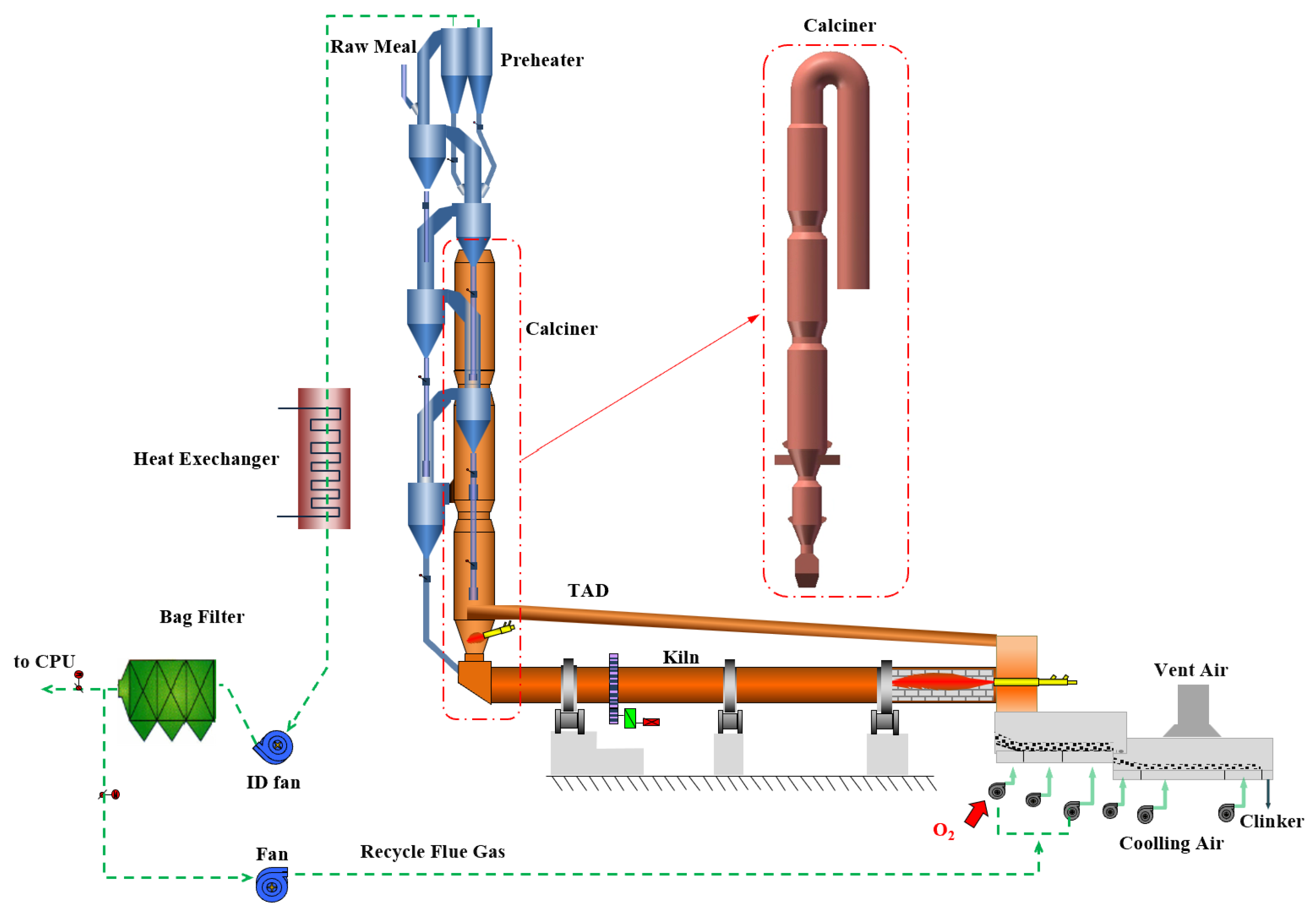 Figure 2. Industrial-grade oxygen exchanges heat with hot clinker on the first grate bed of the cooler, producing high-temperature secondary and tertiary air streams. The secondary air supports combustion in the rotary kiln, while the tertiary air is introduced into the calciner. To regulate oxygen concentrations in these air streams, a flue gas recirculation duct routes exhaust gas from the preheater outlet back to the first grate bed of the cooler. Except for unavoidable air leakage, the entire pyroprocessing system operates without introducing external air. This configuration reduces total flue gas volume and increases CO